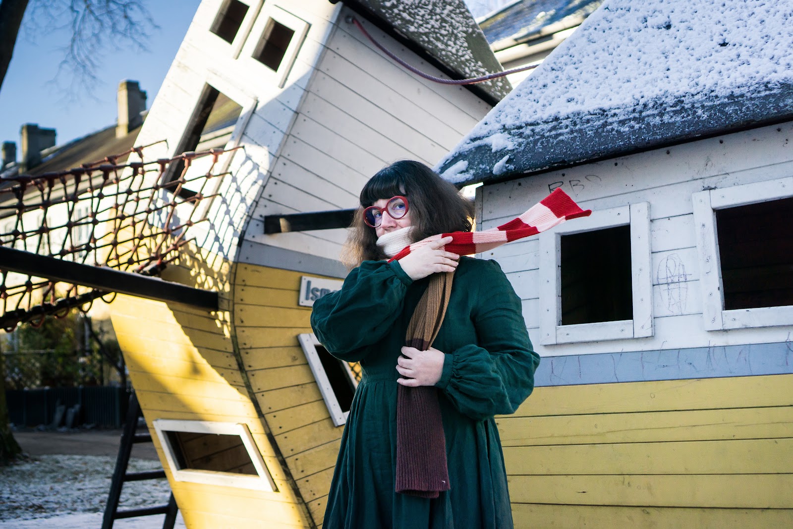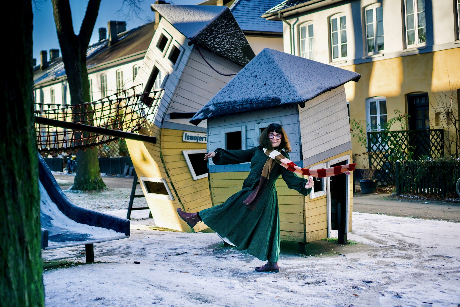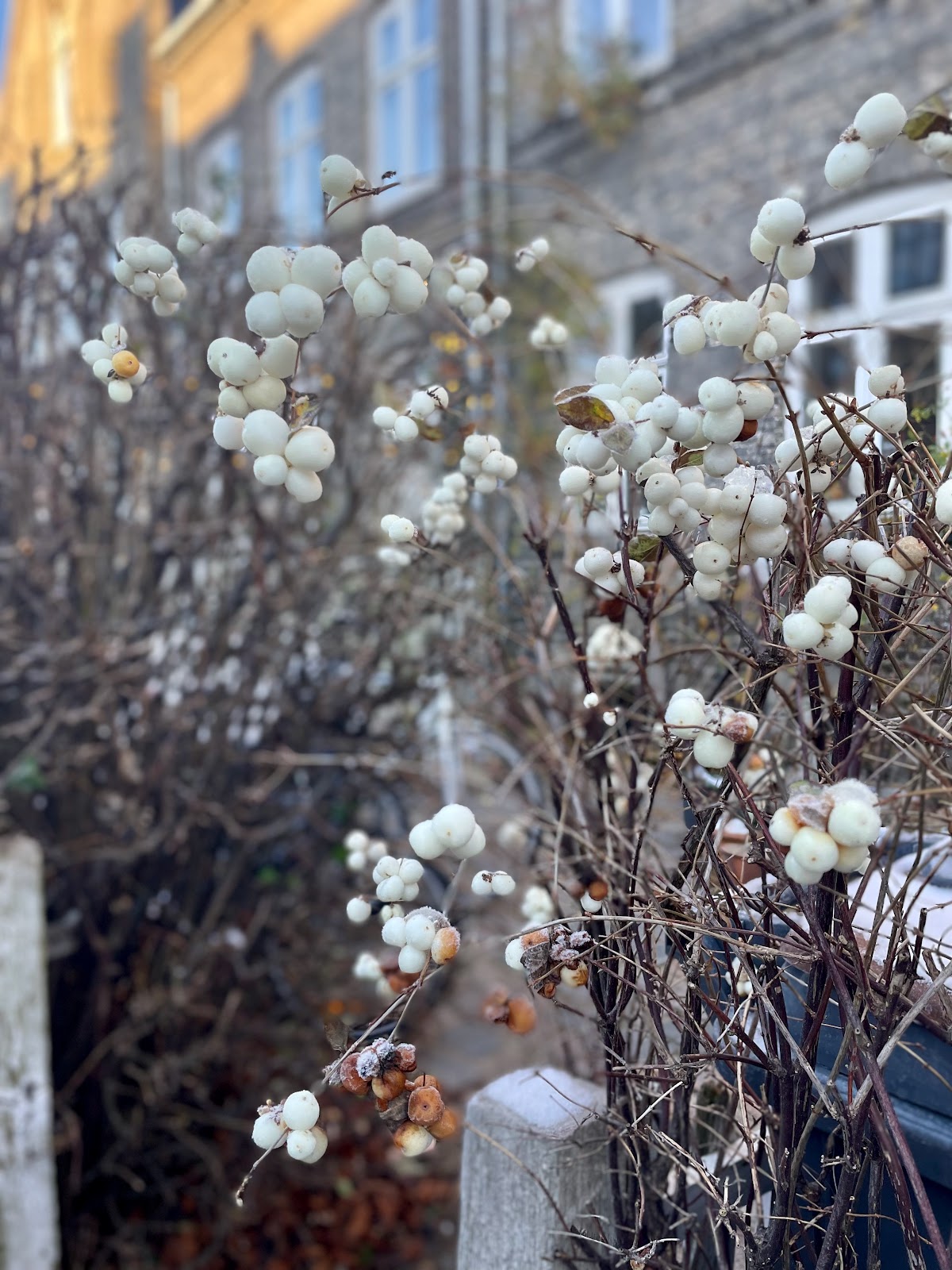 Deuxième journée ensoleillée avec un froid vif mais sec, le temps parfait pour se balader! Nous prenons le métro jusqu’à Trianglen et allons faire des photos dans Olufsvej (l’équivalent local de la rue Crémieux avec ses jolies façades colorées), puis dans le quartier voisin de Brumleby: une enclave de maisonnettes mitoyennes ocre et blanc toutes identiques, créées pour servir de logements sociaux et alignées selon un quadrillage parfait. Rien à voir avec les HLM du quartier où j’ai grandi… Les jardinets sont décorés avec amour, et les aires de jeux saupoudrées de neige donnent envie de retomber en enfance.