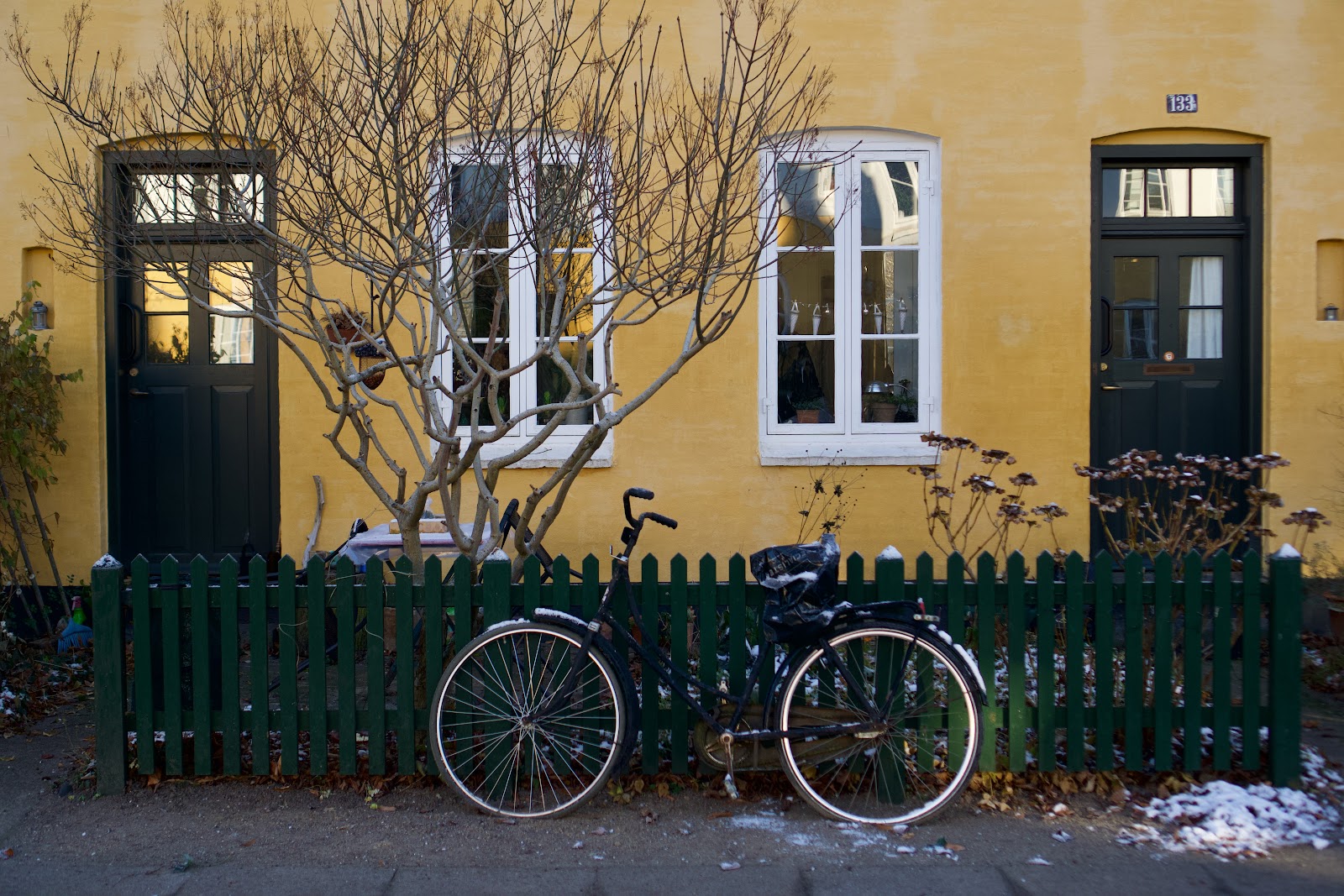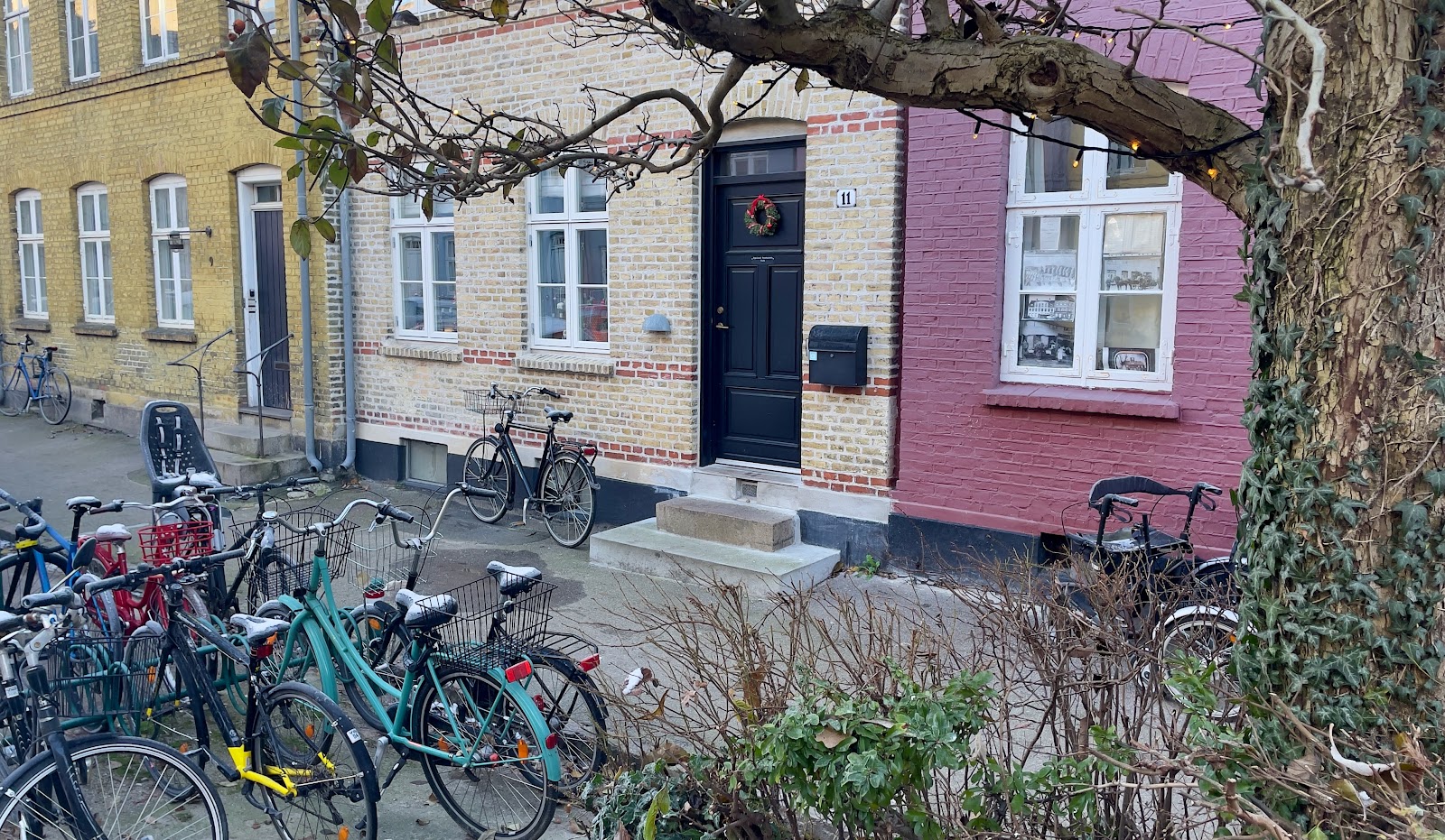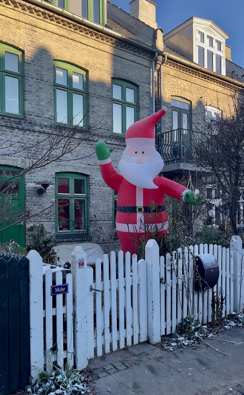 Un peu plus loin de l’autre côté du Sortedams So (« Etang Noir », un des 5 lacs qui ceinturent une partie du centre de Copenhague), les kartoffelaekkerne, d’anciens champs de patates, présentent la même configuration et un charme similaire, bien qu’avec un peu plus de diversité dans l’architecture et les couleurs. Devant les clôtures, entre les rares voitures en stationnement, des tables à pique-nique ou de coquettes cabanes d’enfant. Et bien sûr, des vélos partout. Dans cette ville où les décos de Noël se réduisent généralement à des guirlandes lumineuses sobres et de bon goût, nous éclatons de rire en apercevant un immense Père Noël gonflable qui occupe la quasi-totalité d’un jardinet. Pour le coup, voilà un barbu dont je ne tomberai pas amoureuse!