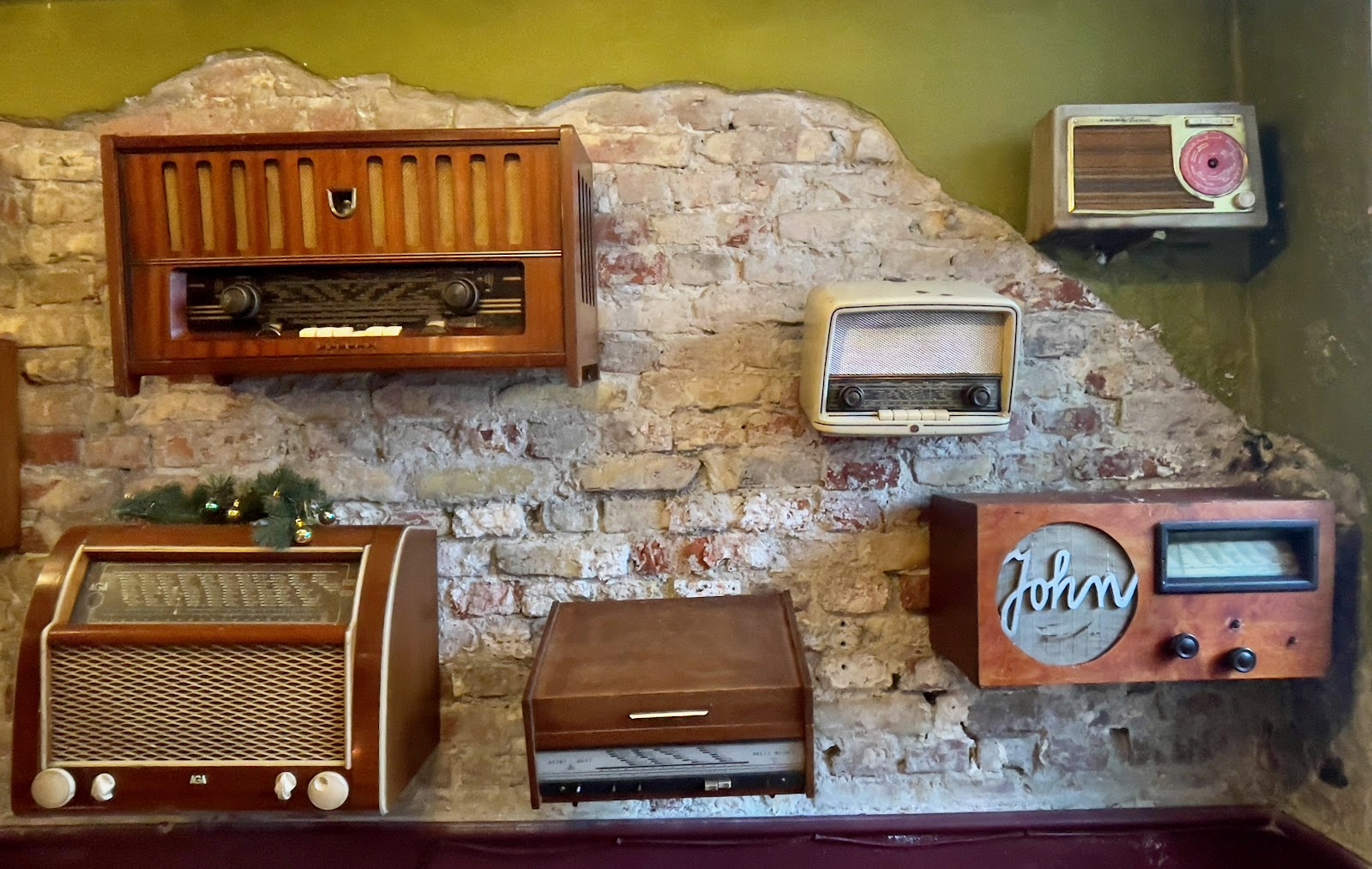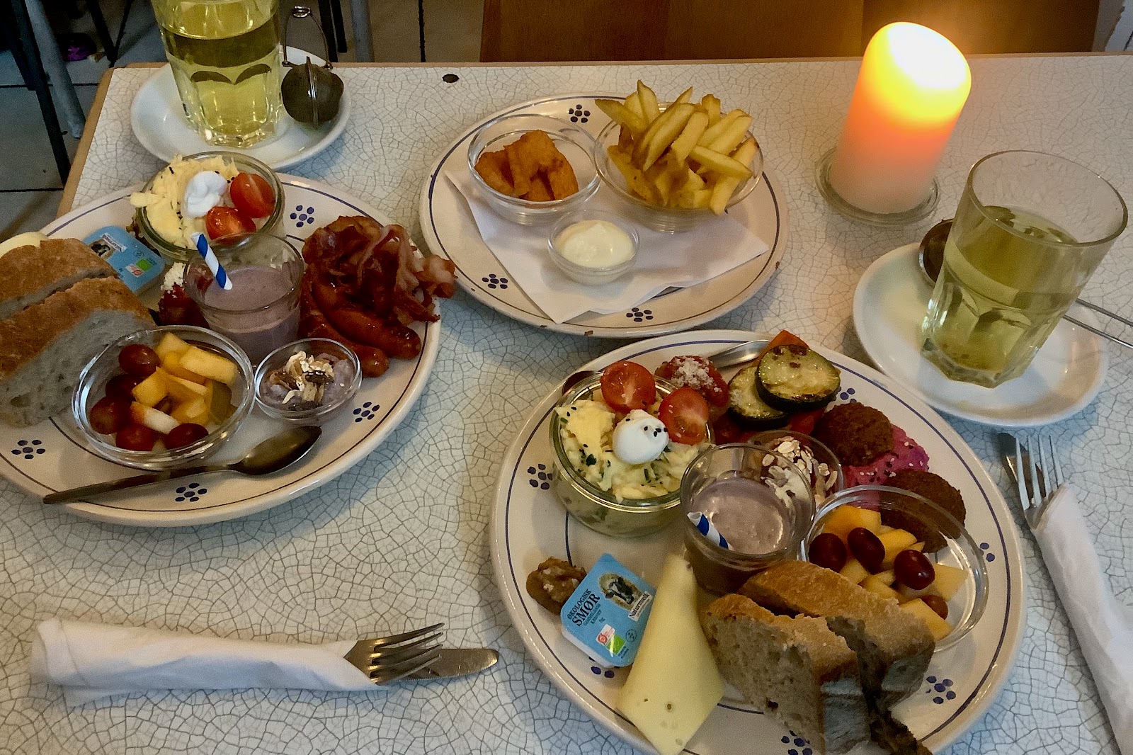 Nous devons écourter cette seconde visite car le thé que j’ai bu ce matin cherche instamment la sortie. Traduction: il faut vraiment, vraiment que je fasse pipi. Nous nous dirigeons vers le centre-ville au pas de charge en espérant trouver un restaurant ouvert. Coup de bol: nous voyons un client pousser la porte en demi-sous-sol du Kalaset, café hyggelig d’excellente réputation que j’avais noté sur la Google Map préparée à la va-vite quelque jours avant notre départ. Pendant que je file aux toilettes, Chouchou réquisitionne une table dans le fond, contre le mur de radios anciennes. Puis nous dévorons deux brunchs, le Mormor avec bacon et saucisses (+ supplément de frites à l’aïoli) pour lui, le Tante Gron végétarien (+ supplément de halloumi grillé) pour moi.