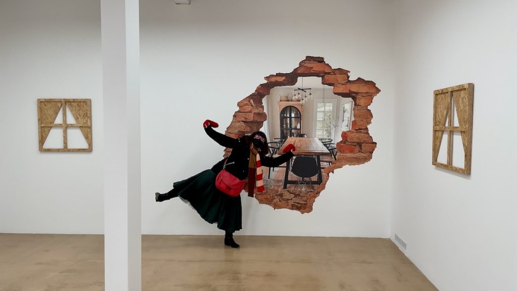 Nous marchons ensuite jusqu’au KIM?, un centre d’art contemporain où j’ai repéré une expo dont le thème m’intéresse. Après avoir lu un long panneau qui explique de quelle façon l’artiste s’est inspirée de la Théorie de Gaïa initialement développée par le scientifique James Lovelock pour se demander: « L’être humain, parasite ou partenaire de la biosphère? », je me retourne et découvre… des gribouillis oranges informes sur les murs. Ah. C’est. Euh. Dans une autre salle, 5 photos en noir et blanc d’objets du quotidien côtoient une série de fausses fenêtres en contreplaqué sous l’appellation « Nothing to write home about ». Nothing at all, indeed.