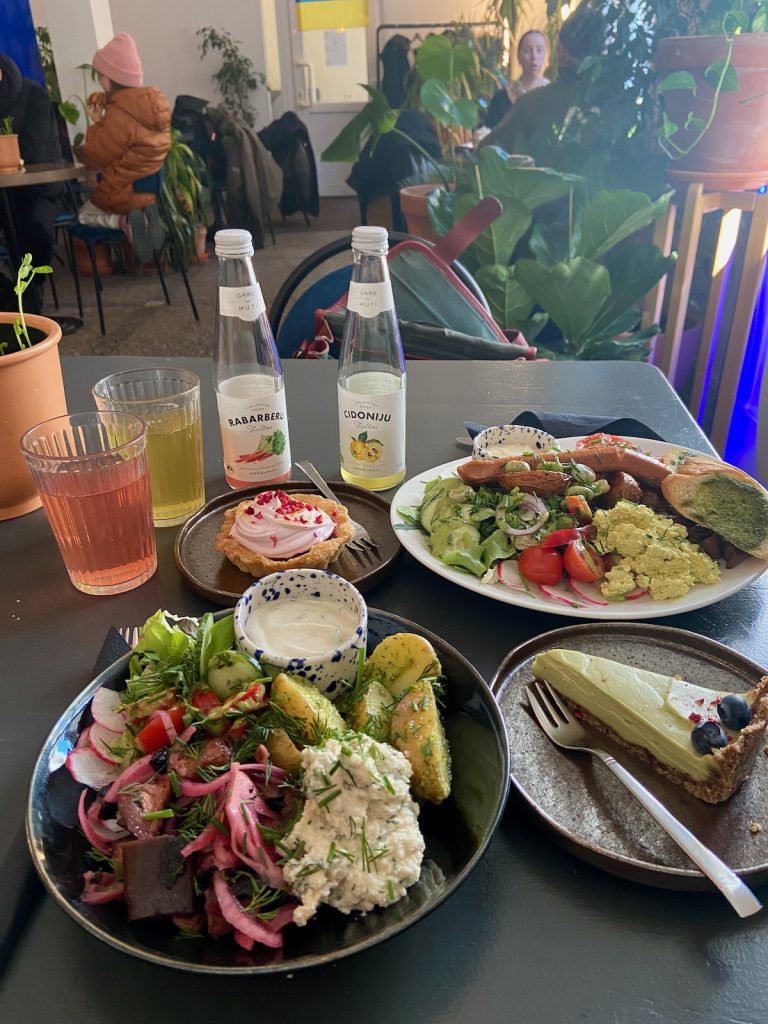 Peu avant 14h, nous voulons appeler un Bolt pour regagner le centre de Riga: problème, il n’y en a aucun à proximité. Le prochain bus passe dans deux minutes et on n’a pas le temps d’atteindre l’arrêt. Le suivant est dans une heure. Chouchou suggère qu’on s’achète des chocolats chauds au distributeur près du guichet, et le temps qu’on les obtienne, miracle! « Ladislas a accepté votre course ». Béni soit le brave homme, tout aussi sérieux et muet que ses collègues. Il nous dépose devant le Mazā Terapija: un resto végétarien qui, comme la plupart des établissements de la ville, pratique le service en continu.