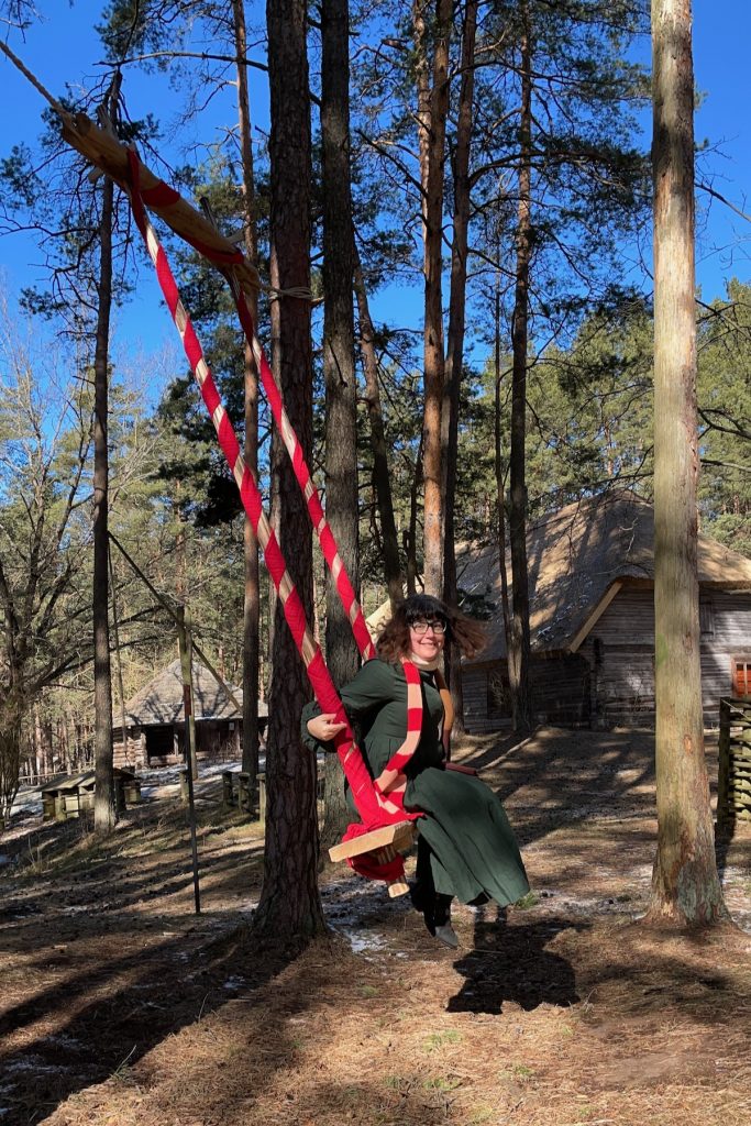 L’avantage d’avoir manqué crever de froid hier à Jurmala, c’est qu’avec un bête 0° et très peu de vent, je trouve les conditions de prise de vue presque agréables. Mon moment préféré: la séance de balançoire sur un énorme siège rustique suspendu entre deux troncs d’arbre. Et aussi la visite de la maison jaune toute pimpante meublée comme au début du 20ème siècle, où une employée travaille sur un coin de table dans une pièce à vivre délicieusement chauffée par un poêle en fonte.