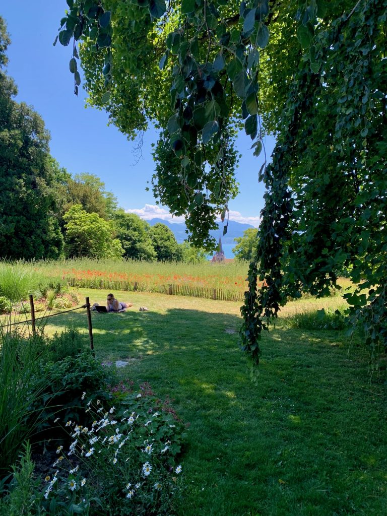 On se promène encore un peu avant de finir l’après-midi sur la terrasse de la brasserie de Montbenon, le premier endroit où Funambuline nous a emmenés manger quand nous sommes arrivés en mai 2015. C’est là que j’ai découvert l’ail des ours, parce que personne ne me dit jamais rien. Aujourd’hui, Chouchou et moi nous contentons d’un crumble à la rhubarbe. Lady Pops choisit une tartelette au citron, tandis que les Shalbuline optent pour « un dessert au houblon ». Je décèle comme une tendance. Vers 18h30, nous sommes chassés par une combinaison « table réservée par d’autres », « soleil couchant en pleine face » et « approche de l’heure du dîner ». Lady Pops, Chouchou et moi reprenons le train jusqu’à Sonpatelin pour finir la journée avec sa famille.
