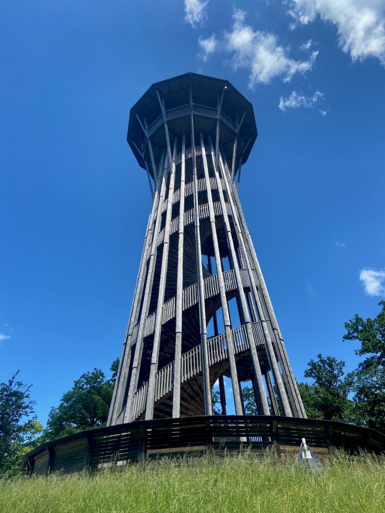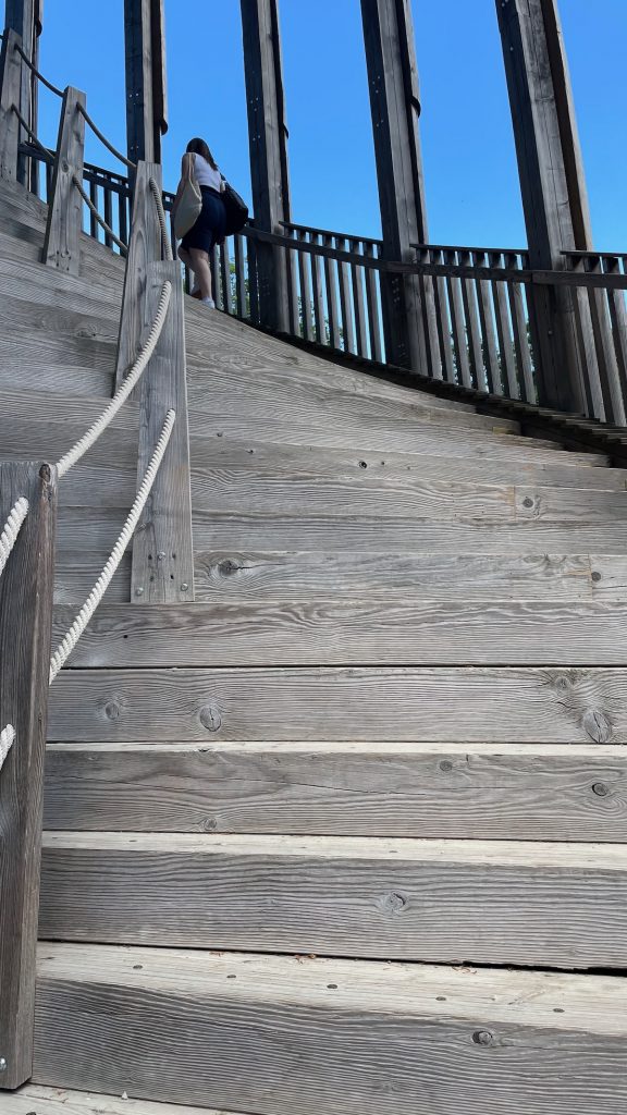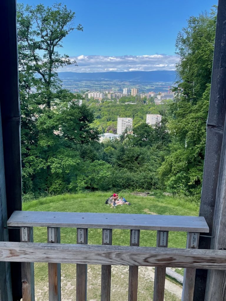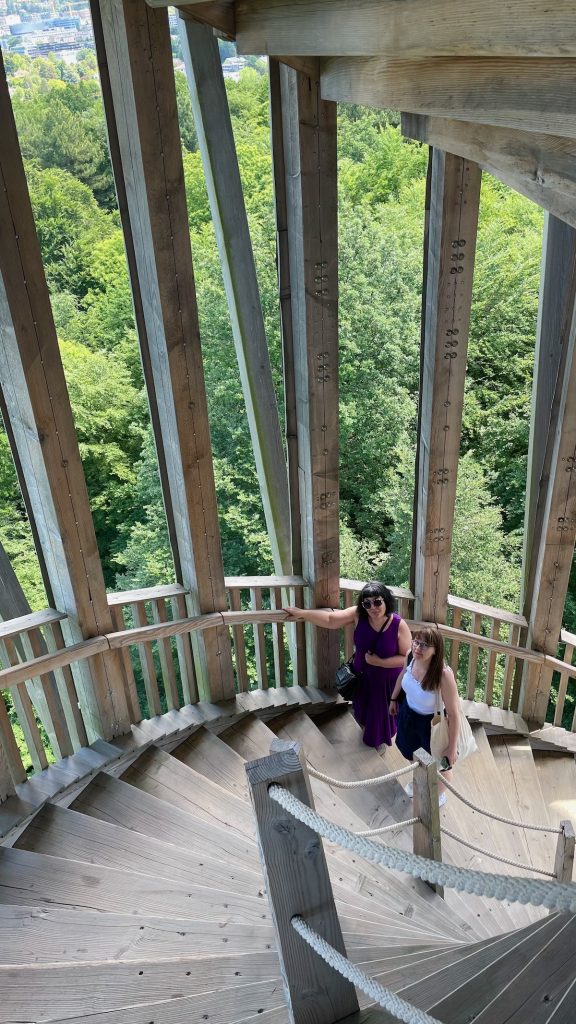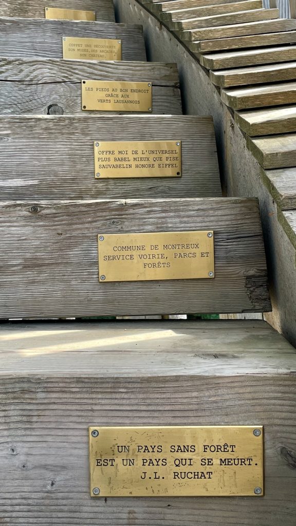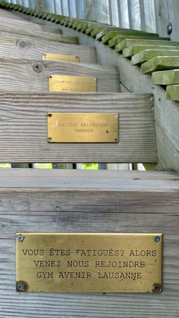 Une fois tous les estomacs hydratés ou lestés selon les besoins, nous prenons le métro-qui-grimpe, puis un bus pour nous rendre jusqu’à la Tour de Sauvabelin. Situé dans les hauteurs de Lausanne, cet édifice en bois massif haut de plus de 35 mètres compte 300 marches qui forment une double hélice parfaitement symétrique. Chacune d’elles, ainsi que certains des montants de la balustrade, porte une petite plaque de laiton sur laquelle est gravé un court message des entreprises locales et des particuliers ayant financé sa construction. D’en bas, j’ai l’impression qu’atteindre le sommet va être une torture. En réalité, l’ascension des 3 niveaux est très agréable pour peu qu’on prenne son temps et qu’on s’amuse à déchiffrer au passage les messages tantôt drôles, tantôt émouvants.