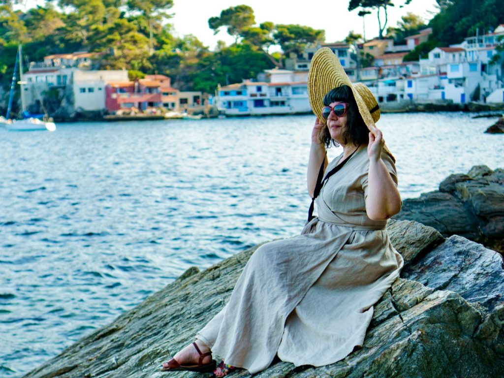 ★ Même en attendant la fin de l’après-midi, je pensais qu’on allait crever de chaud en allant à l’anse Méjean, mais pas du tout. Train et bus climatisés; plage étonnamment peu fréquentée pour un week-end à plus de 30° et moitié à l’ombre passé 17h30. Nous sommes tout de suite hyper satisfaits des photos que nous prenons. Tout est dans le chapeau – une grande galette en paille à 15€ que j’avais commandée chez Satan l’an dernier, qui a mis 3 mois à arriver de Chine toute pliée dans une enveloppe et que j’ai remise en forme à la main après l’avoir mouillée dans ma baignoire.