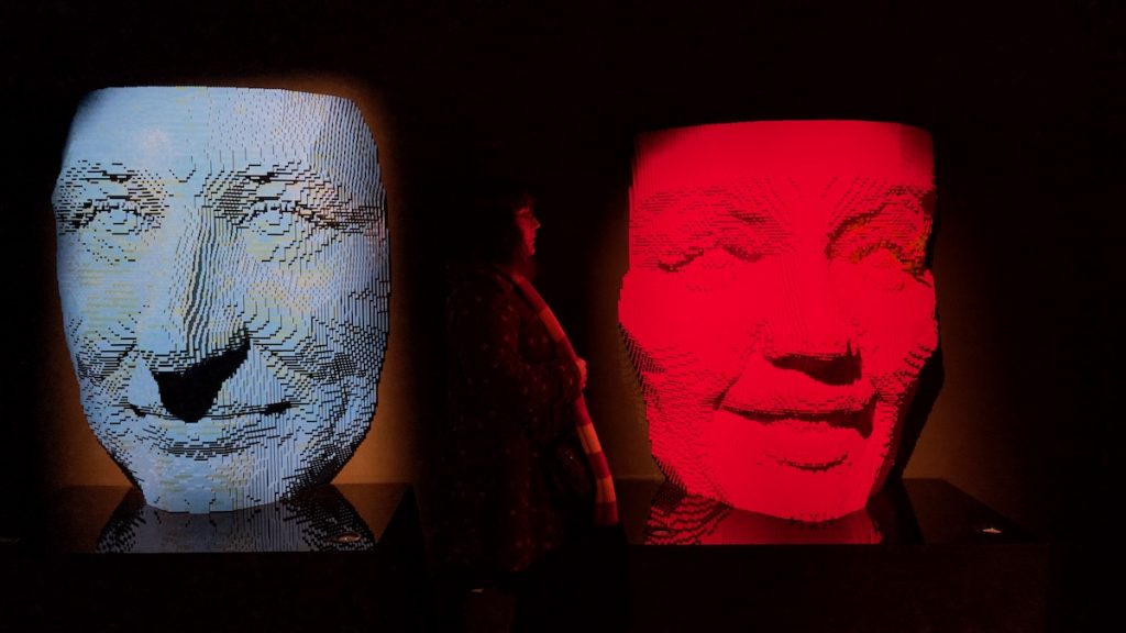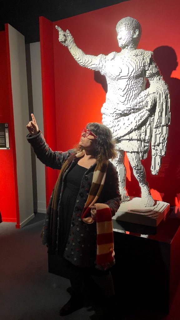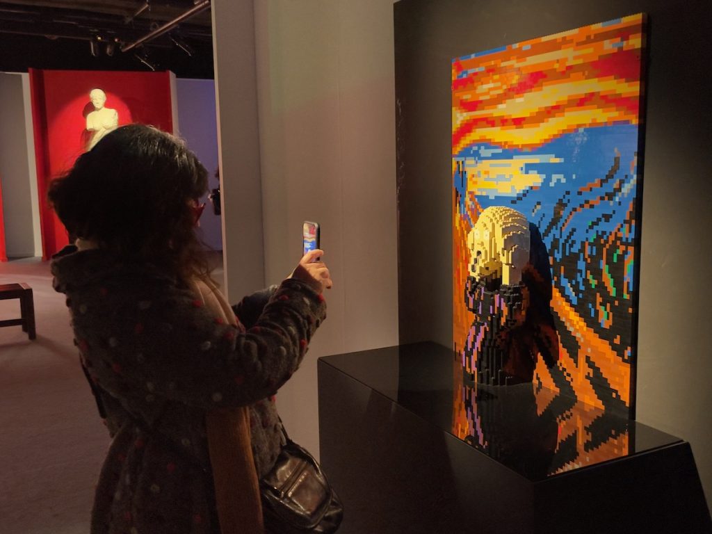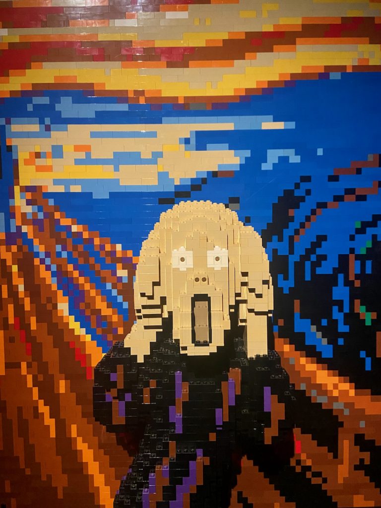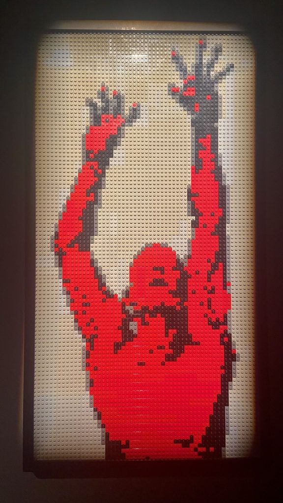 Bien sûr, les sculptures sont étonnantes d’inventivité ou d’habileté – je pense notamment aux re-créations d’oeuvres archi-célèbres et aux portraits réalisés façon pixel art avec la tranche des briques Lego les plus fines qui existent. Et on ne peut qu’être impressionné.e par le T-Rex qui constitue la pièce maîtresse de l’exposition. Cependant, à aucun moment je ne me suis sentie interpelée ou engagée par ce que j’avais sous les yeux. Si nous n’avions pas pris de photos, nous aurions probablement fait le tour en moins d’un quart d’heure. J’ai pensé me venger à la boutique du musée, mais je l’ai trouvée complètement nulle, sans aucune boîte marrante ni même un sticker ou une carte postale représentant l’affiche pour mon art journaling).