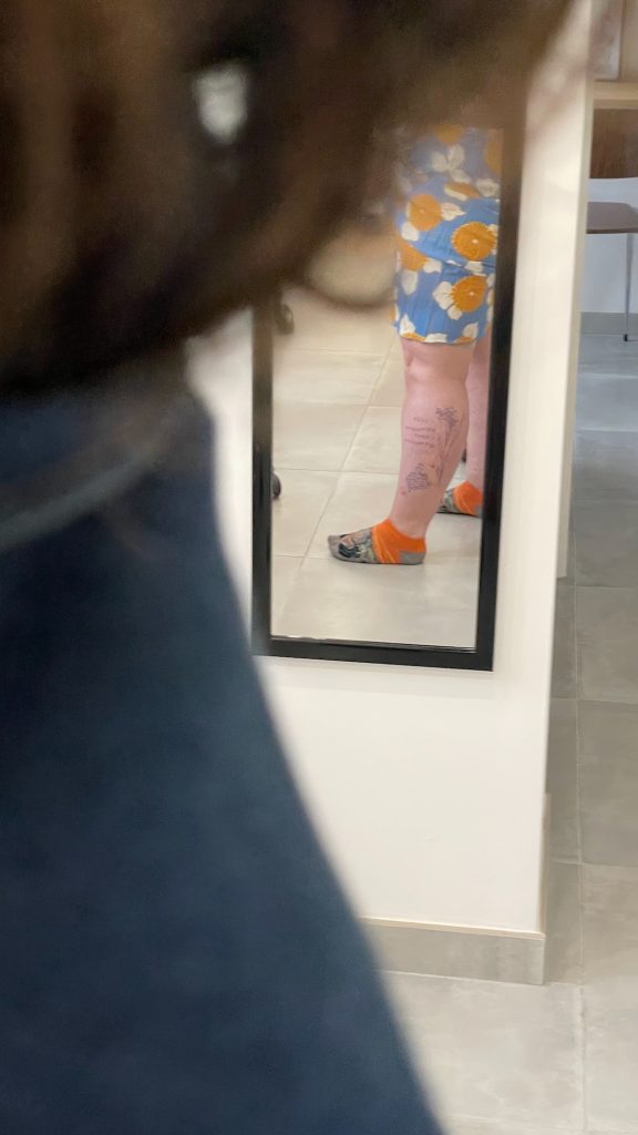Depuis samedi dernier et pour une durée totale de 15 jours, je nettoie mon tatouage à la main avec du savon doux, le sèche en le tamponnant avec du Sopalin et l’enduis un peu plus tard de crème cicatrisante. D’après Alien, ma peau a bien pris l’encre dès le départ; quand j’ai retiré le film plastique avec lequel iel avait protégé les motifs à la fin de la séance, on voyait que le résultat allait être beau et ne nécessiterait sans doute pas de retouches (gratuites pendant les deux premiers mois). J’ai eu mal au mollet jusqu’au lendemain matin, et les zones en couleurs sont restées rouges, sensibles et un peu gonflées pendant 48h de plus. Je vous montrerai un avant/après une fois la cicatrisation terminée, mais je n’ai pas pu résister à l’envie de publier d’ores et déjà cet article!