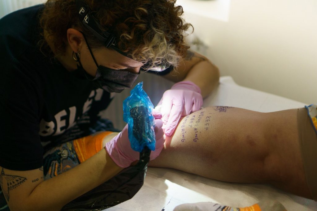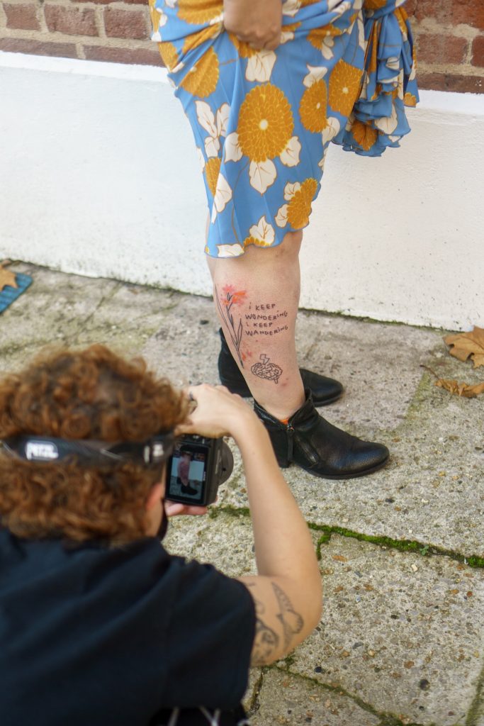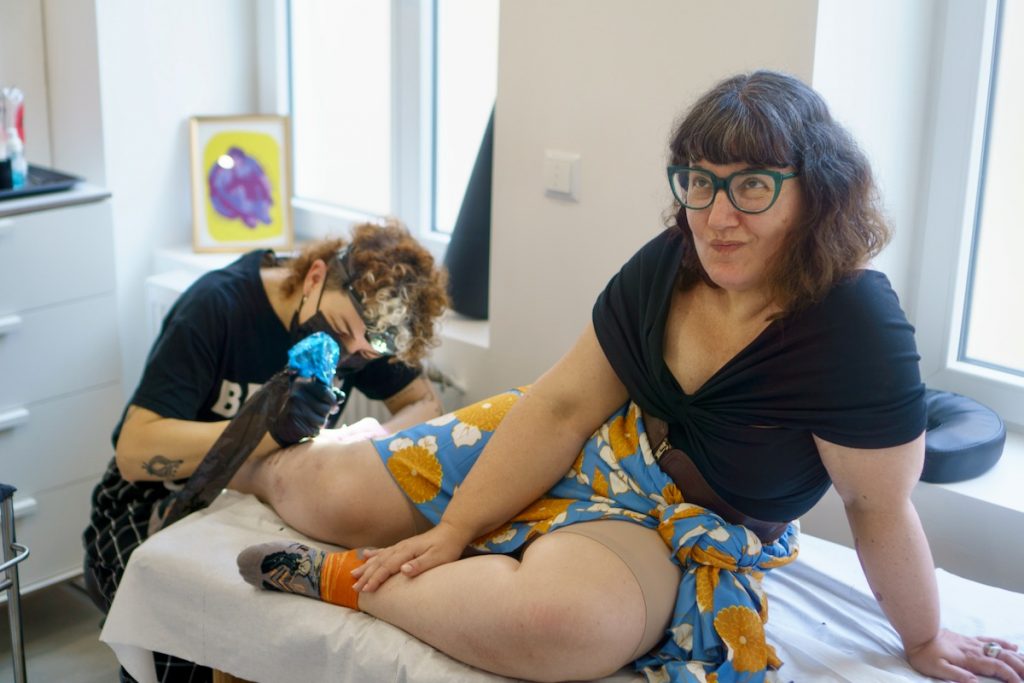 Nous sommes arrivés à l’atelier en même temps qu’Alien. Le courant est tout de suite bien passé. J’ai senti que j’avais affaire à quelqu’un de très bienveillant et à l’écoute, qui m’a même demandé la permission avant de toucher ma jambe pour la première fois. A l’aide de gabarits en papier, nous avons déterminé le placement exact des motifs sur mon mollet droit, que j’avais pris soin de bien hydrater les jours précédents mais qui était encore marqué par les piqûres de moustiques subies durant mon dernier séjour à Toulon. Alien m’a suggéré de les mettre un peu plus sur le côté que je ne l’aurais fait spontanément, et comme j’écoute généralement les conseils des pros, j’ai accepté. Puis iel a transféré les dessins sur ma peau; je suis grimpée sur la table et on a cherché la meilleure position pour qu’iel puisse travailler confortablement sans que je chope des crampes au bout de 5 minutes. A chaque étape, iel a checké avec moi que tout allait bien, m’a prévenue avant de commencer à piquer, s’est inquiété de ma douleur… Et puis on a papoté d’un tas de trucs pendant les deux heures qu’a duré l’encrage – d’abord le noir, puis les différentes couleurs. C’était la première fois que j’avais le sentiment de faire une vraie rencontre et pas juste d’être l’objet d’un acte technique. J’ai eu mal tout le long (que ce soit pour un tatouage ou pendant l’exercice physique, j’ai les endorphines les plus feignasses du monde), mais j’ai quand même passé un très chouette moment.