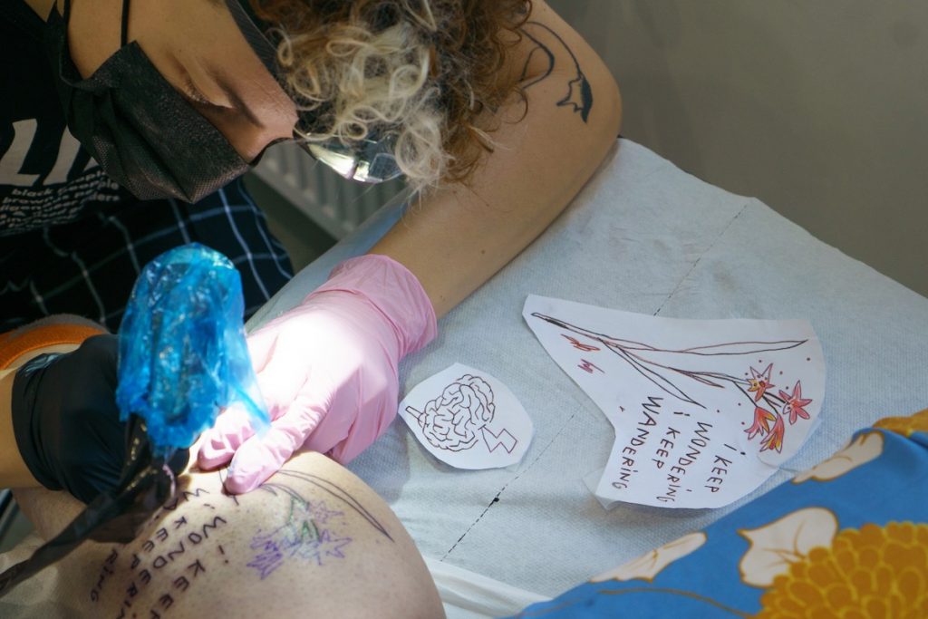 Pas découragée, je me suis fait tatouer pour la quatrième fois samedi dernier. Depuis plusieurs mois, je suivais l’artiste Alien Poëme sur Insta, et j’adorais ses dessins aux crayons de couleur faussement naïfs ainsi que la poésie de ses légendes. J’ai fini par craquer sur un des flashs qu’iel proposait en story, et je l’ai contacté pour prendre rendez-vous. Je voulais que ce tatouage-là symbolise mon diagnostic d’autisme et le changement de chemin intérieur qu’il avait provoqué. Au motif initial, j’ai donc demandé à l’artiste de rajouter un cerveau dans lequel serait planté un éclair, qu’iel a dessiné juste pour moi. On a échangé par mail pour se mettre d’accord sur les détails. En principe, iel ne reçoit dans son atelier de Roubaix que des client.es seul.es, mais quand j’ai expliqué que je venais de Bruxelles et que j’étais hyper anxieuse, à la fois de faire un trajet nouveau pour moi et de me retrouver seule pendant plusieurs heures avec une personne inconnue, iel a accepté sans souci que Chouchou m’accompagne. Le rendez-vous initial, calé en septembre, a dû être repoussé quand Alien a attrapé le Covid. Mais samedi dernier, les étoiles se sont enfin alignées: j’ai bien entendu le réveil qui a sonné à 5h30, notre TGV n’a eu que 10 mn de retard et nous n’avons eu aucun problème pour nous rendre à Roubaix en métro depuis la gare de Lille Europe.