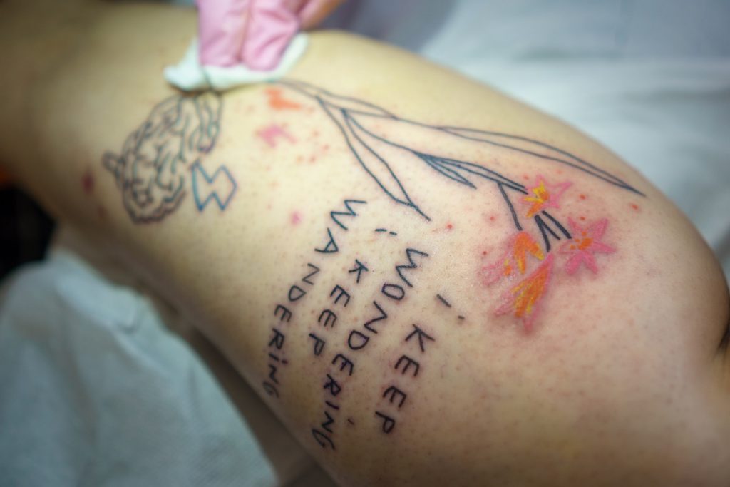 Je me suis fait tatouer pour la troisième fois en 2011. J’avais un motif très précis en tête: une Ugly Doll rouge dont je trimballais un exemplaire en peluche depuis le début de ma relation avec Chouchou 5 ans plus tôt, et qui avait même eu son propre blog jusqu’à ce que nous l’égarions lors d’une promenade dans les rues de Toulouse. (Si vous êtes curieux.ses, ce blog existe toujours sur Blogger et devait s’appeler quelque chose comme « Les aventures de Régis ».) Du coup, j’ai pensé que n’importe quel tatoueur ferait l’affaire, et je me suis adressée à celui qui exerçait au coin de notre rue à Bruxelles. Grosse erreur: il a fait un boulot de merde, avec plusieurs dérapages bien visibles sur les lignes noires. Et manque de bol, ce tatouage se trouvant sur l’intérieur de mon avant-bras gauche, c’est celui que j’ai sous le nez le plus souvent. Parfois je me dis que je devrais le faire reprendre, mais j’ai la flemme. Et puis l’encre rouge ne vieillit pas très bien; ce serait vraiment un gros chantier.