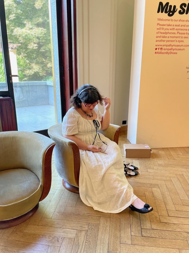5 février 2022. Quand nous voulons faire des photos à l’ambiance sylvestre, c’est presque toujours dans la forêt de Soignes que nous choisissons de nous rendre. Il fait très froid ce jour-là, et je gèle sur place chaque fois que j’ôte mon manteau. Chouchou se montre un peu dubitatif lorsque j’entreprends d’escalader ce tronc abattu – Team JeVeuxToujoursGrimperPartout – mais au final, la série donne vraiment bien. 29 mars 2022. Devant notre Air BnB de Riga, nous attendons le guide engagé la veille au soir sur un coup de tête pour qu’il nous conduise à la Colline des Croix, de l’autre côté de la frontière lituanienne. Et soudain: il se met à neiger. 17 juillet 2022. Nous visitons l’exposition « Portrait of a lady » à la fondation Boghossian de Bruxelles, et je participe à l’expérience Empathy Museum qui consiste à porter les chaussures de quelqu’un d’autre tout en écoutant son témoignage. Chouchou me trouve jolie sur cette photo, et moi, je, euh, je respecte son opinion.