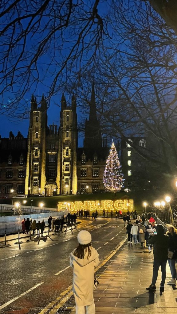 C’est pourtant sans mauvaise surprise et avec seulement 40 mn de retard sur l’horaire prévu que nous atterrissons à Edimbourg en ce lendemain de Noël – un jour que les Britanniques appellent Boxing Day, et qui est également considéré comme férié. Les commerces de l’aéroport sont fermés, mais le tram qui rallie le centre-ville en une demi-heure circule normalement. Tout juste le temps de prendre deux billets aller-retour aux automates situés en bout de quai et de sauter à bord, et nous voilà partis! Il est 16h et il fait encore vaguement jour; mais le temps d’atteindre l’arrêt de Princes Street, la nuit est complètement tombée, mettant en valeur les lumières du marché de Noël et de la grande roue multicolore. Nous marchons jusqu’à l’arrêt de bus voisin de The Mound et attendons trèèèèès longtemps un 8 qui tarde à se pointer. Le thermomètre a chuté sous zéro; il y a pas mal de vent, un peu de pluie, et je commence à douter de la brillance de mon idée de passer les fêtes en Ecosse.