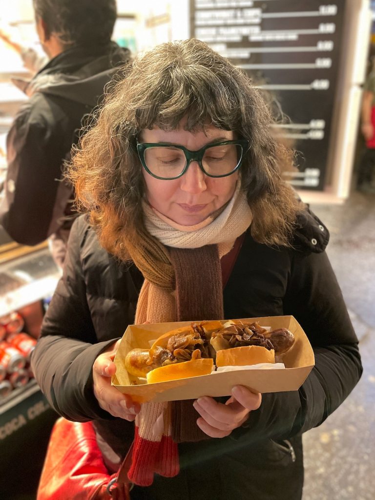 Avant même la fermeture du marché, le froid nous pousse à nous replier vers un arrêt de bus déplacé pour cause de travaux. Cette fois encore, nous attendons bien plus longtemps que prévu. Je suis à un cheveu du lumbago, et pour protéger mon dos, je m’accroupis recroquevillée sur moi-même dans le renfoncement d’une porte d’hôtel. Quand le bus à deux étages arrive, nous montons dedans avec soulagement. Il n’y a bien entendu pas de places assises, et surtout… pour une raison obscure, il ne redémarre pas avant dix bonnes minutes. Autant dire que lorsque nous poussons de nouveau la porte de notre appartement, je suis au bout de ma vie.