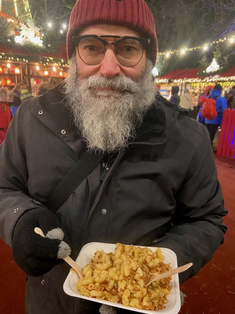 Lorsque nous atteignons enfin notre Air BnB, deux heures se sont écoulées depuis notre atterrissage. Points positifs: l’entrée dans les lieux est rapide et facile grâce à une boîte à clés; l’appartement nous semble très cosy; notre logeuse a dressé un joli sapin dans un coin du salon et rempli le frigo et les placards de cuisine du nécessaire pour des petits-déjeuners copieux; le chauffage fonctionne très bien, et il y a même un poêle à gaz. Points négatifs: pas de bureau ou de table assez confortable pour s’installer avec les MacBook, si bien que je ne bloguerai pas de tout le séjour; une chasse d’eau extrêmement capricieuse dans les toilettes; une soufflerie de salle de bain hyper bruyante, et… un lit en 120, alors que la plupart des couples se trouvent désormais à l’étroit dans du 140. Par ailleurs, redescendant à pied vers le centre-ville pour profiter du marché de Noël avant sa fermeture, nous nous apercevons qu’il nous faut presque une demi-heure alors que l’annonce indiquait la moitié de ce laps de temps. Avec une météo pareille, la différence n’est pas négligeable…