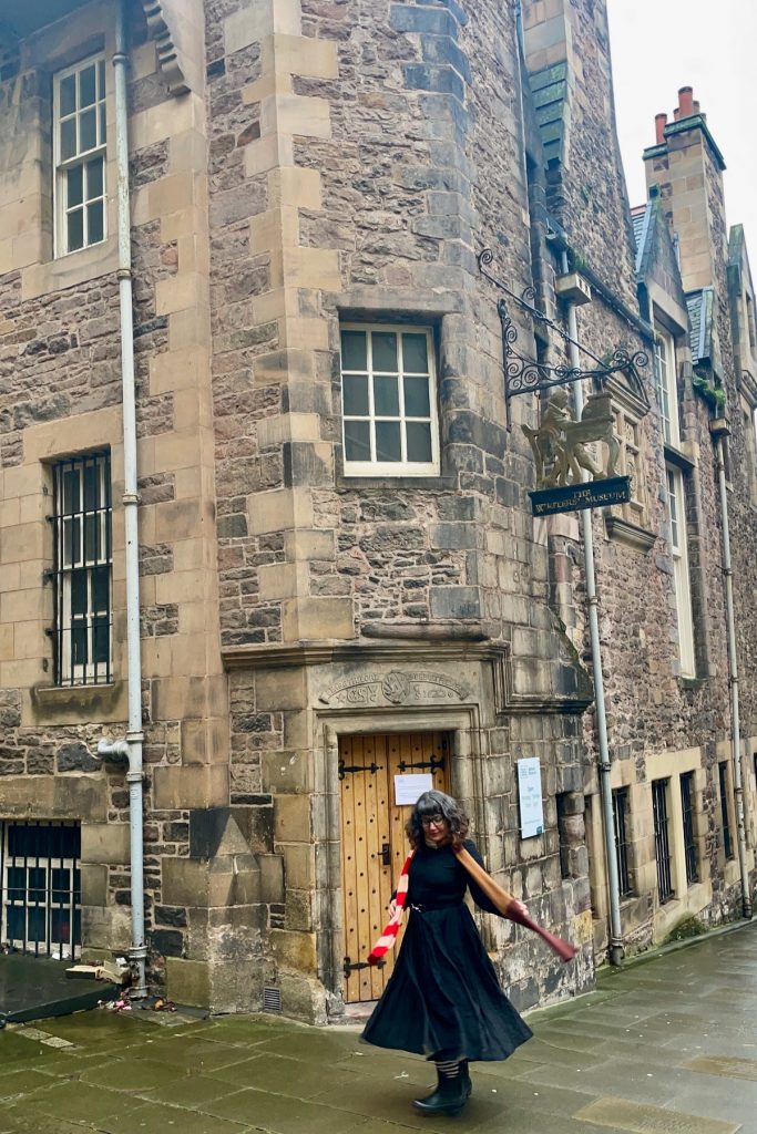 Lorsque nous ressortons, la pluie s’est changée en neige légère, qui ne tiendra sans doute pas mais que j’apprécie quand même. Une météo intéressante pour explorer le cimetière de Greyfriars, dont nous avions fait une visite guidée assez pittoresque en 2016. Il est néanmoins plus petit que dans mon souvenir; je n’y vois pas des tas d’endroits où poser en étant à la fois un peu protégée et respectueuse du lieu. La seconde opération-éclair de la journée ne donne pas d’aussi bons résultats que la première, mais c’est le jeu, ma pov’ Lucette. Parfois on obtient un résultat miraculeux, et parfois on est juste déçu. Un peu comme dans toute entreprise créative, en somme.