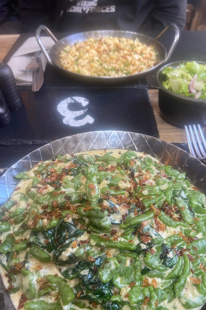 Par pure flemme de pousser jusqu’à la partie chinoise pour voir si le restaurant Mandschu est ouvert aujourd’hui, nous décidons de retourner à la taverne de Rutmor, mais de manger en terrasse pour éviter le bruit cette fois. La serveuse nous informe que ça ne va pas être possible malgré le panneau indiquant que les tables extérieures sont réservées à leur clientèle. Si on avait une langue en commun, je chercherais à savoir pourquoi; là, je préfère laisser tomber. Par chance, l’intérieur du restaurant est plus calme qu’hier, et en attendant dix minutes, nous réussissons à obtenir une table dans la petite salle cosy de devant, où nous mangeons des pâtes locales servies dans un caquelon encore chaud. Peu raffiné mais très bon.
