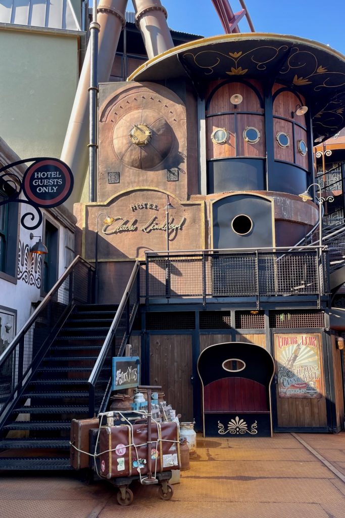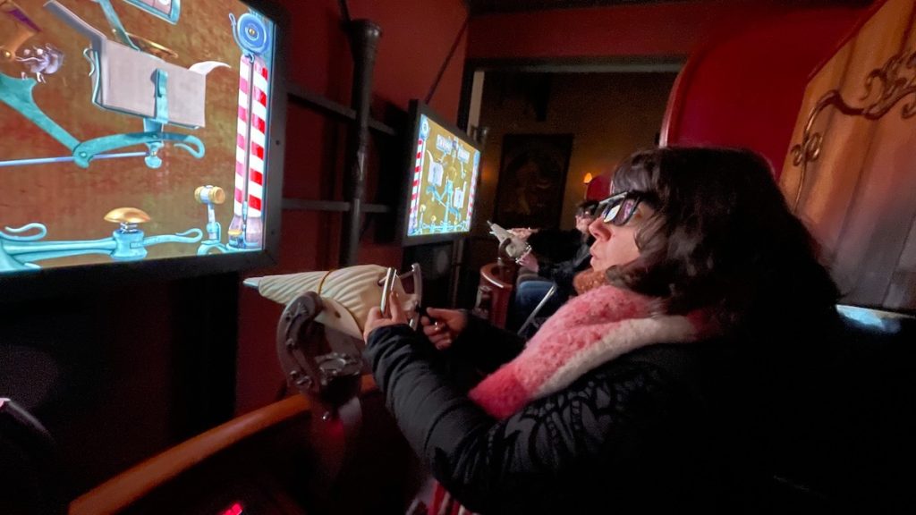 Parce qu’il faut bien que je rapporte un souvenir, je décide de retourner à la boutique chercher un petit quelque chose. Sur le chemin, j’avise l’attraction familiale Maus en Chocolat dont l’aspect visuel me séduit, et j’entraîne Chouchou à l’intérieur. La file d’attente est un peu longue, mais elle serpente à travers une maison très joliment décorée, et nous en profitons pour tenter de comprendre les instructions que des écrans diffusent en teuton non sous-titré. Apparemment, nous allons chausser des lunettes 3D, prendre place à bord d’un petit train dont les voiturettes tournent dans tous les sens et tirer à l’aide d’une poche à douille sur les souris pilleuses de cuisine qui apparaîtront le long de notre trajet.