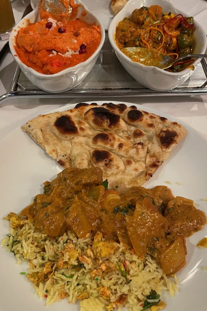 La carte est extrêmement variée; parmi les nombreux plats dont je lis le nom pour la première fois de ma vie, je choisis un poulet akhini en sauce crémeuse à l’ananas, et Chouchou un shalimar kharni moyennement épicé avec viandes mixtes. Plus du riz pilaf et, bien entendu, des garlic naans. Nous nous régalons, et sitôt rentrés à l’appartement, j’envoie un message à Gillian pour la remercier de son excellente recommandation.
