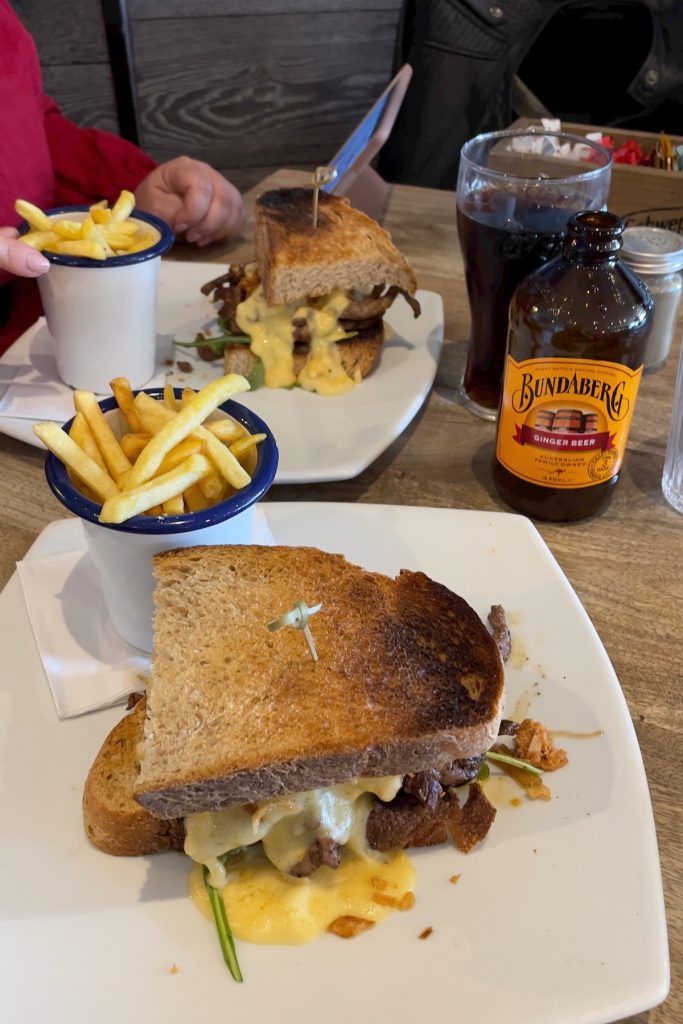 Après ça, on cherche un endroit où déjeuner parmi les petits restos aux devantures colorées et aux terrasses grouillantes de monde. Parce que j’aime son auvent rayé qui me fait penser à Coney Island, je jette mon dévolu sur The Pier, où nous dévorons des Philly cheesesteaks passablement crapuleux.