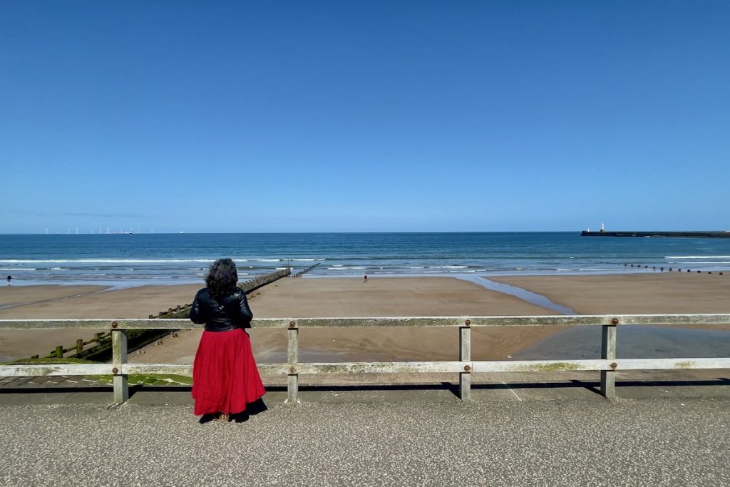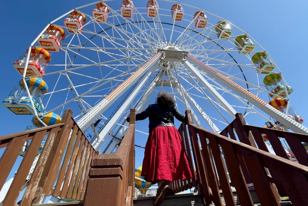 En débouchant enfin sur la plage, je pousse des couinements de joie à la vue d’une grande roue. Puis je déchante rapidement, car les nacelles ne bougent pas du tout. Je me dis qu’elle n’ouvre peut-être qu’en début d’après-midi, mais une recherche Google nous confirme qu’elle devrait tourner depuis 10h du matin. C’est un jour férié et la moitié de la ville se presse sur le bord de mer. La religion des propriétaires leur interdit de gagner de l’argent, je ne vois pas d’autre explication. Comme il y a quand même moyen de s’approcher sans escalader quoi que ce soit, on se console avec un petit shooting vite fait.