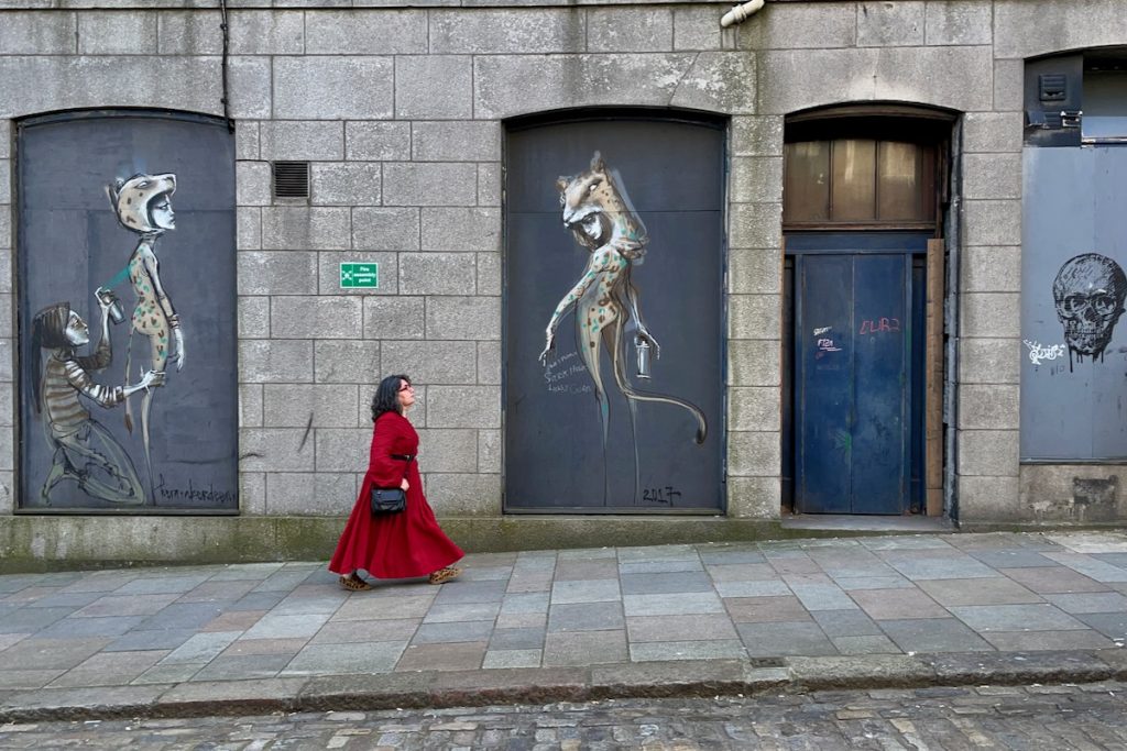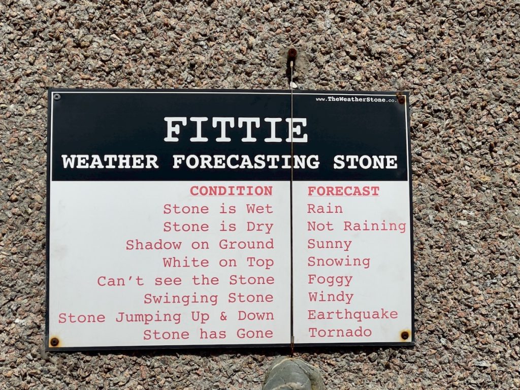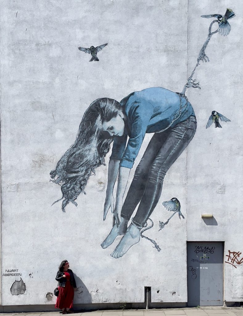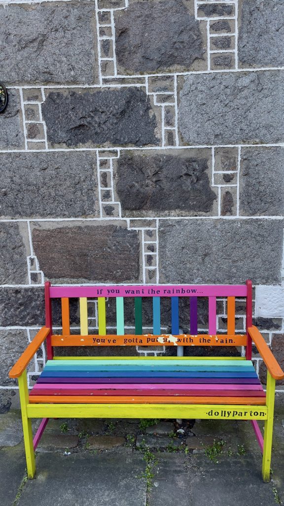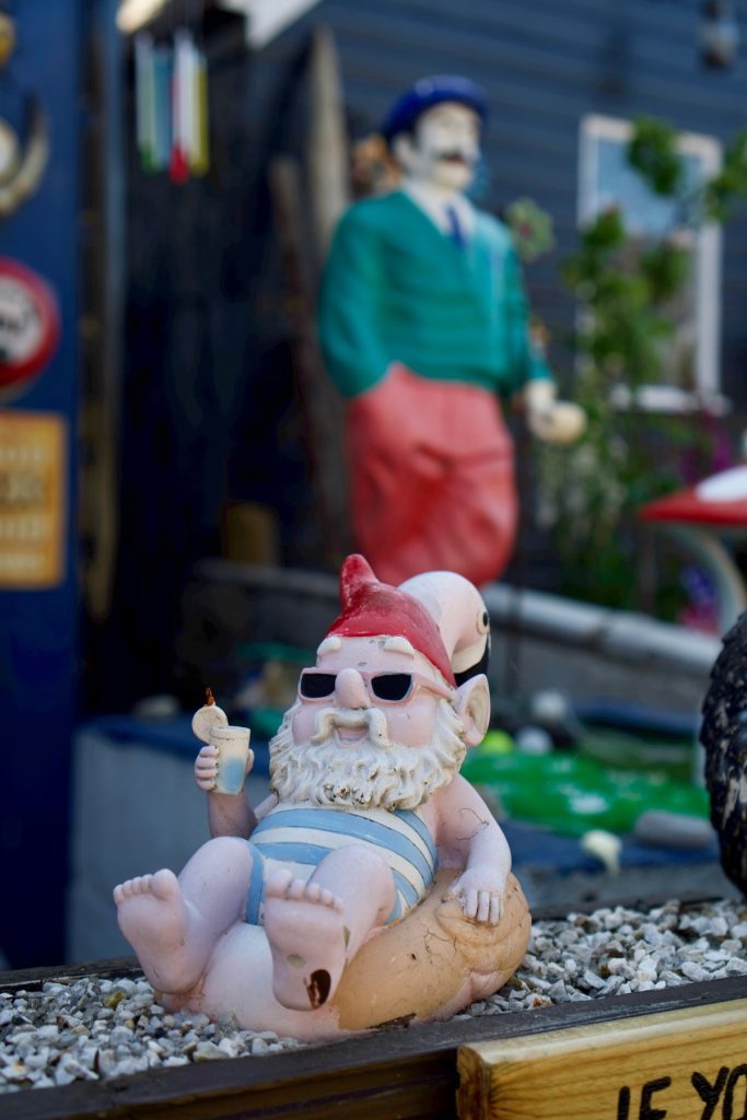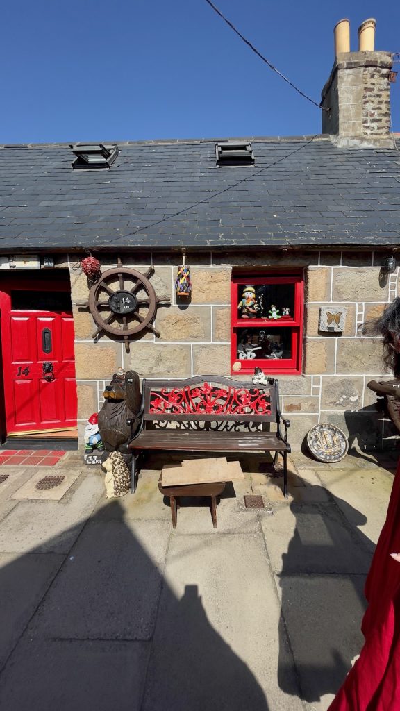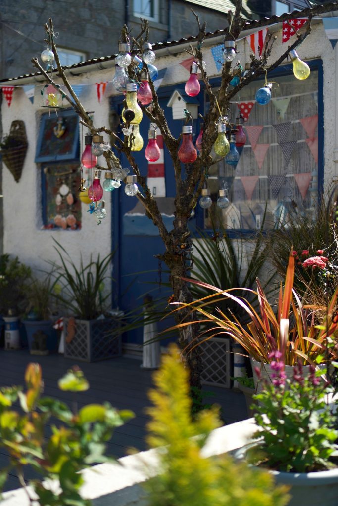 Rassasiés, nous déambulons le long de la plage en direction de l’ancien village de pêcheurs de Footdee (prononcer « Fittie »), souvent cité comme l’attraction numéro un d’Aberdeen. Je m’attendais du coup à y trouver glacier, salon de thé, boutique de souvenirs ou autres commerces destinés aux touristes de passage. En réalité, il semble que cette ville ne veuille décidément pas de mon argent. Les rues parfaitement rectilignes ne sont bordées que de maisons modestes à la déco super kitsch. Ca et là, les habitants prennent le soleil sur un banc. Je me sens gênée de me promener chez eux et de prendre des photos, donc d’exploiter leur environnement quotidien, sans rien pouvoir leur donner en retour.