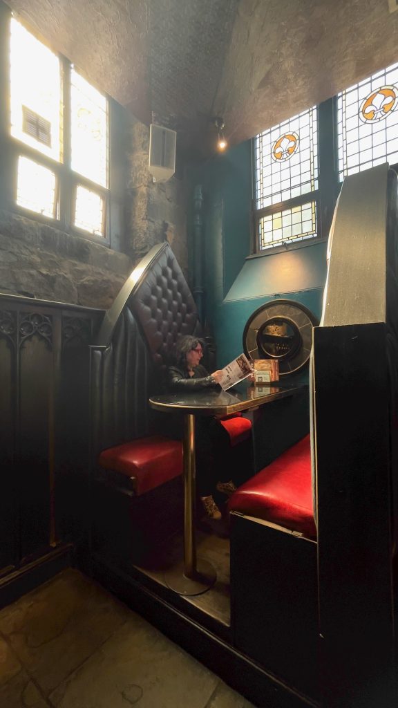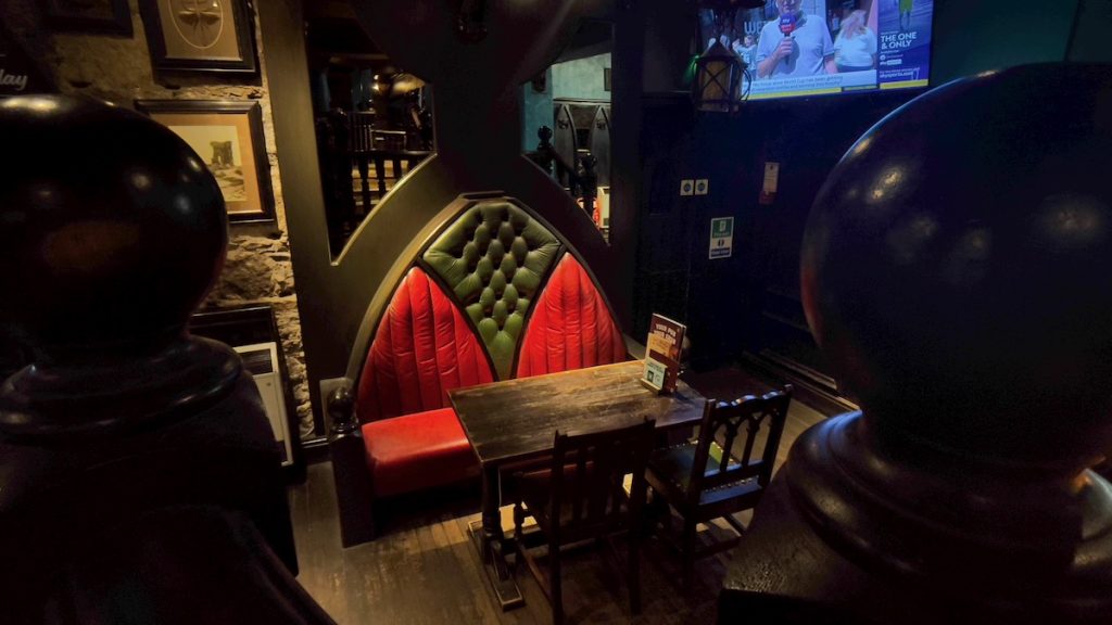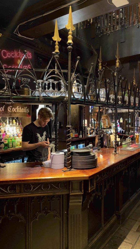 L’intérieur est décoré façon château de Dracula, avec notamment des toilettes dissimulées derrière des bibliothèques en trompe-l’oeil. Dommage pour les écrans plats qui diffusent des matchs: ça casse un peu l’ambiance! Au moins, la musique est sympa. Les cocktails, bien que ne brillant pas par leur originalité, sont très bon marché (£5.50) et portent les noms des péchés capitaux, des vertus cardinales ou des cavaliers de l’Apocalypse. J’hésite entre un Death et un Humility avant d’opter pour ce dernier.