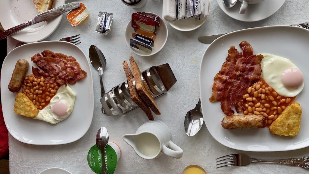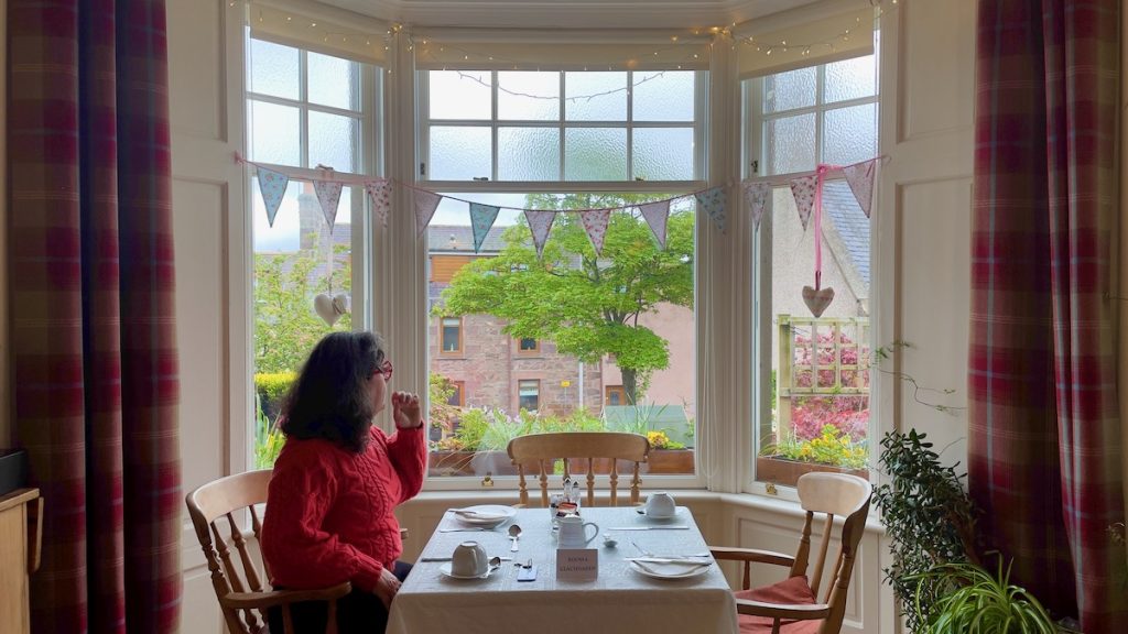 Nous descendons dans la ravissante salle à manger où on nous a réservé la table près de la baie vitrée. Tout en dévorant ce qui sera sans doute le dernier scottish breakfast du voyage (là, mes artères théoriquement interdites de charcuterie poussent un énorme soupir de soulagement), j’écoute notre hôtesse commenter pour une autre cliente les photos de famille exposées sur un mur. J’apprends ainsi que son mari et elle vont bientôt être grands-parents, et qu’ils cherchent à vendre Arduthie House afin de lever le pied. La maison n’ayant pas trouvé preneur en tant qu’établissement commercial, ils vont maintenant la proposer comme logement privé. Si j’avais les moyens, je crois que je l’achèterais tout de suite…