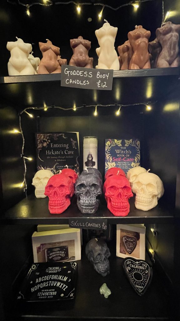 Plus haut, dans Candlemaker Row, je me décide à pousser la porte de Black Moon Botanica, boutique de produits ésotériques repérée avant notre voyage précédent mais qui était fermée pendant les fêtes de fin d’année. Je m’y laisse tenter par une bougie en forme de crâne et un tarot magnifiquement illustré qui coûte deux fois plus cher que tous les autres – ce dont je m’aperçois bien sûr à la caisse, quand je n’ai plus le courage de dire « Euh en fait je ne vais pas le prendre ». La vendeuse m’offre une sélénite en me disant que je devrai la poser sur mon bureau afin qu’elle… Je ne saurai jamais ce que ce caillou est censé faire: je suis trop occupée à museler ma voix intérieure pour l’empêcher de rire au nez de cette dame adorable qui n’a pas mérité que je lui inflige mon opinion peu charitable sur ses croyances.