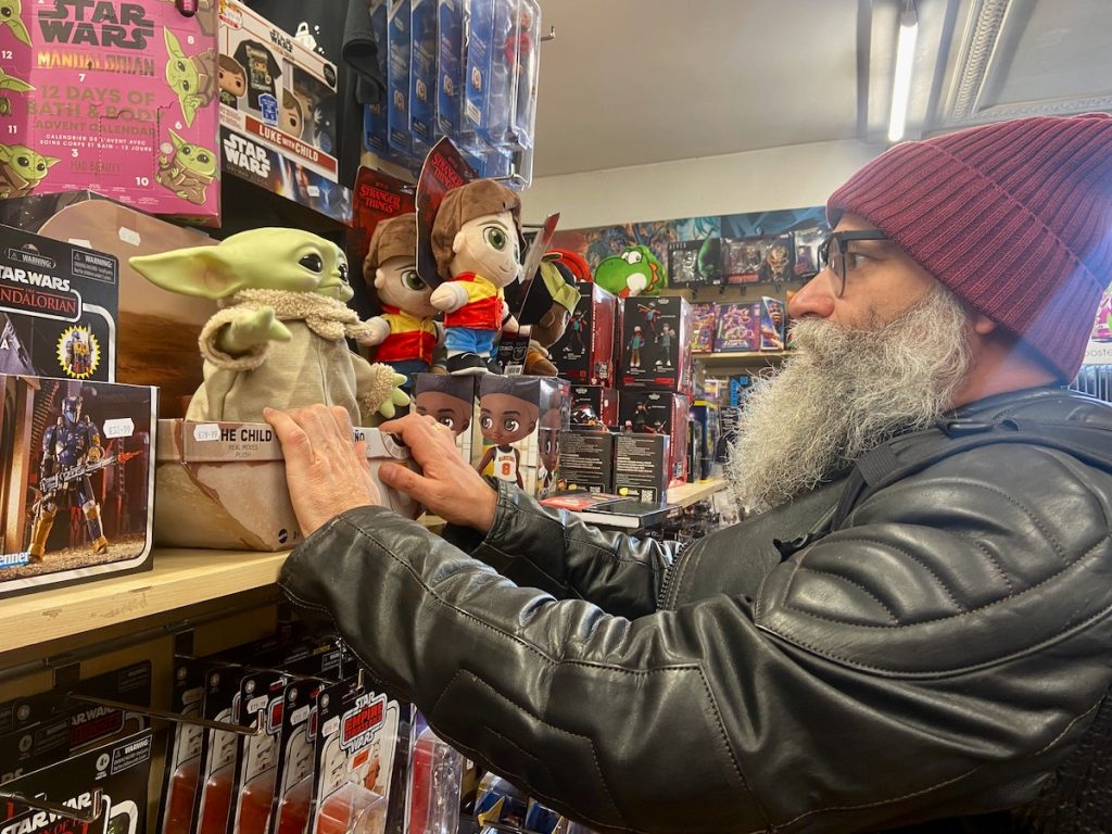 Après ça, on fait un saut au Forbidden Planet situé non loin: la plus récente quête de vie de Chouchou, c’est de trouver un jouet baby Yoda Grogu avec des boutons qui disent « yes » and « no » quand on appuie dessus. Mais bien que le magasin vende différentes versions du personnage, aucune ne correspond aux desiderata chouchouïens.