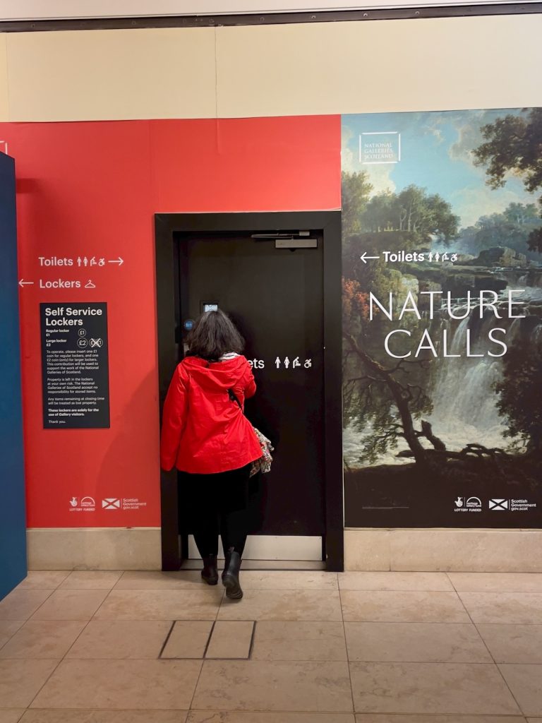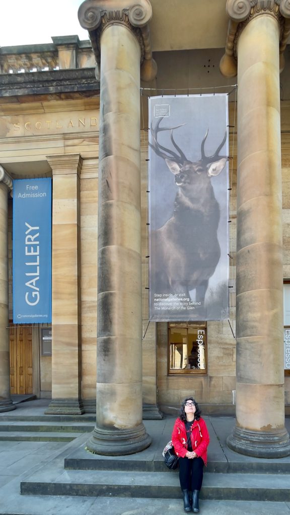 Nous arrivons à la Scottish National Gallery – le bâtiment du Mound qui abrite la partie classique des collections – un peu avant l’ouverture, que nous attendons patiemment avec une foule grandissante d’autres touristes. J’ai décidé de consacrer nos dernières heures sur place à admirer d’autres paysages de William McTaggart, dont le musée possède quelques oeuvres. Nous avons déjà vu la collection permanente (très belle et très intéressante) lors d’un séjour précédent. Aussi, dès l’ouverture des portes, je demande à une employée où je peux trouver les Précieux. Elle m’aiguille vers le fond de la galerie. Là, je me renseigne auprès d’un autre employé… qui m’apprend que la partie du musée où sont d’ordinaire exposés les McTaggart est actuellement en travaux, donc, qu’ils sont au coffre et qu’on ne peut pas les voir. Ma déception est grande.