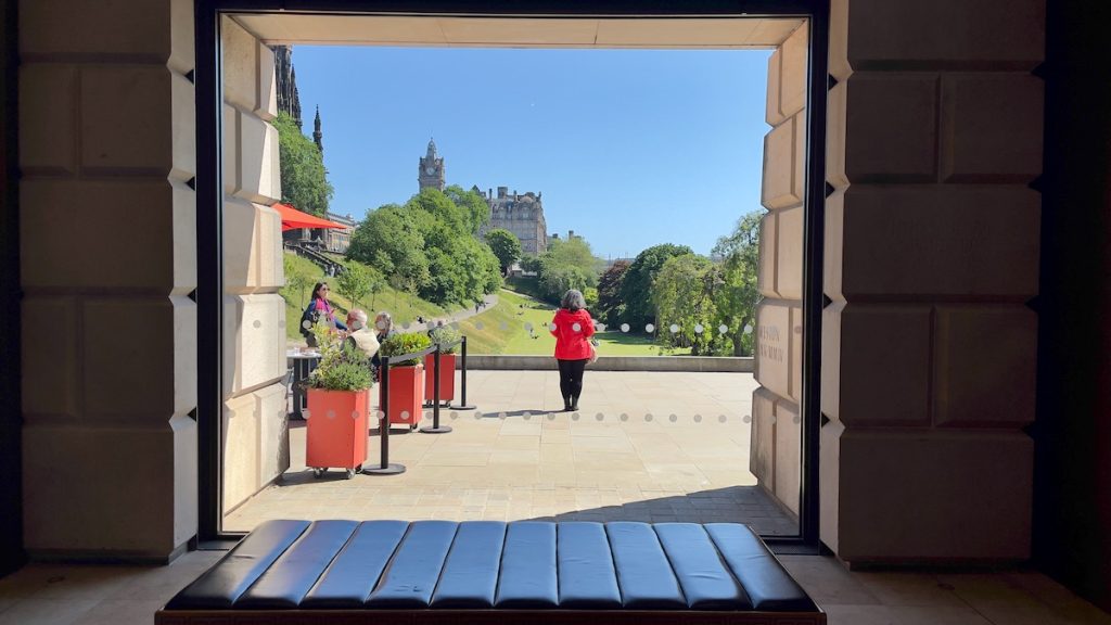 Bien que regorgeant d’autres merveilles, la boutique du musée n’a de nouveau pas la plus petite carte postale d’un tableau de William McTaggart. J’en ressors tout de même avec plusieurs carnets et un marque-page en cuir du Reverend Walker (personnage d’un célèbre tableau d’Henry Raeburn). Chouchou, qui s’est mis à en utiliser récemment pour journaler, craque aussi pour trois carnets et un pack de stylos.