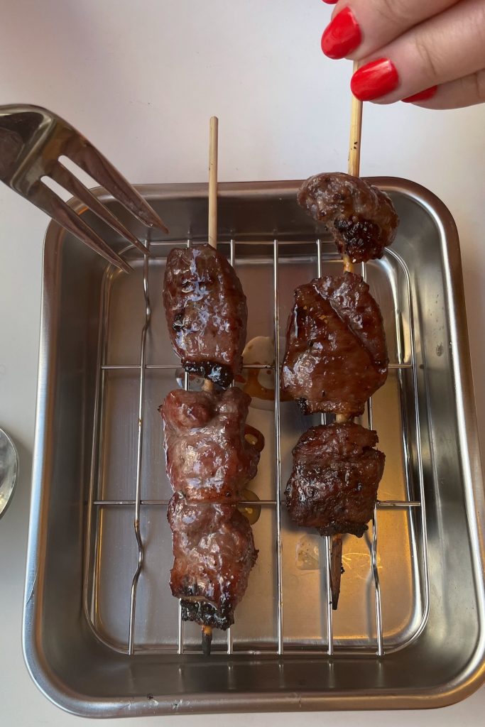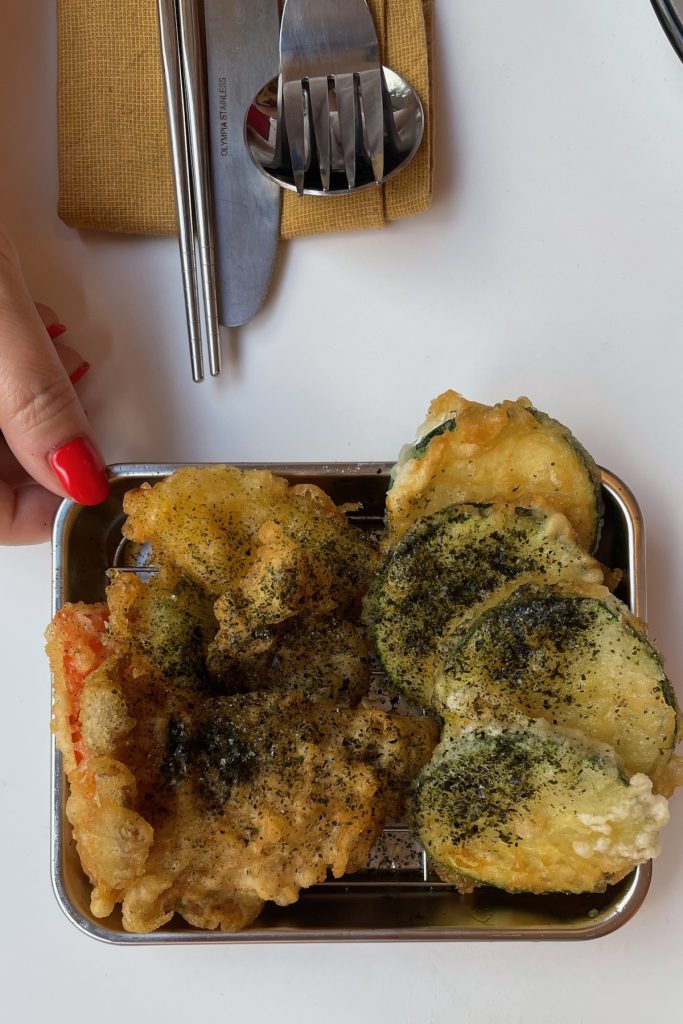 Le Konchû propose un menu différent le midi et le soir. Le midi, c’est curry, LE plat de comfort food japonais facile à préparer et adaptable à tous les goûts. Une base de nouilles udon ou de riz, plus une garniture carnée ou végétarienne, recouvertes d’une sauce épaisse plus ou moins sucrée et piquante – et hop! J’avoue que je n’en raffole pas; aussi, j’ai préféré aller au Konchû le soir. Là, la carte se compose d’un assortiments de petits plats façon tapas. Un concept très à la mode en ce moment, puisque les trois derniers restaurants que nous avons testés fonctionnent ainsi…