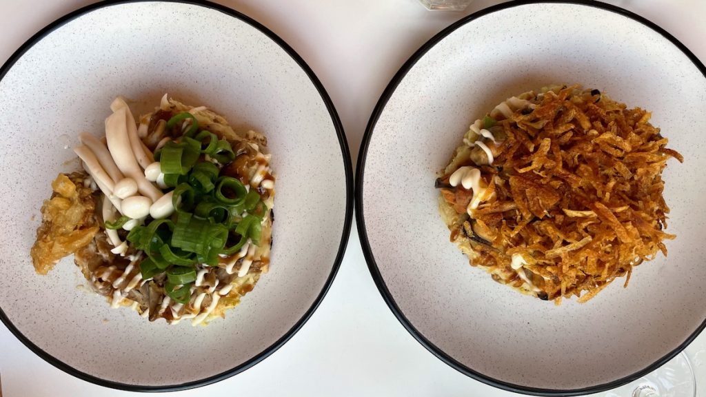 Ce qui nous avait essentiellement attirés au Konchû, c’était la présence à la carte d’okonomiyaki, ces espèces de crêpes garnies dont nous raffolons. J’ai pris la version aux champignons – des pleurotes en huître – tandis que Chouchou a hardiment opté pour la moule-frite (à droite sur la photo). Les deux étaient surprenantes et délicieuses, une vraie réussite gustative.