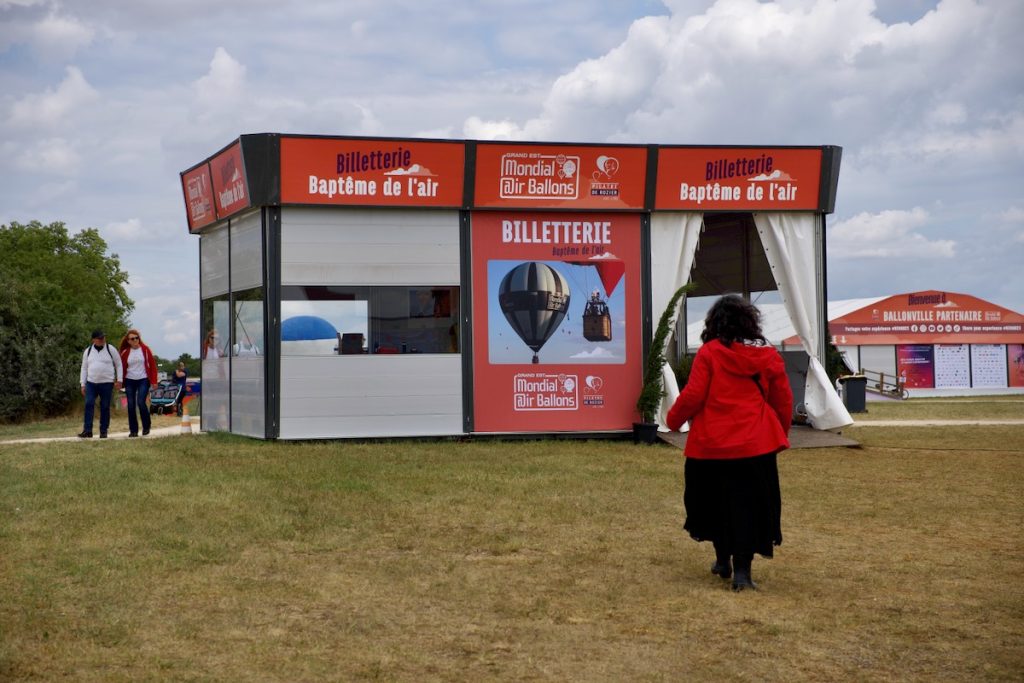Pour les baptêmes, malheureusement, tout était complet dans les deux cas, m’a-t-on appris à la billetterie située du côté Est de l’aérodrome. J’ai demandé s’il était possible qu’il y ait des désistements de dernière minute; on m’a répondu que c’était très rare, qu’il n’y en avait eu que 2 en tout au cours des 5 jours écoulés depuis le début de cette édition 2023, mais que je pouvais quand même revenir à 18h30 au moment de l’appel des passagers et croiser les doigts. J’ai alors eu l’idée brillante de déplacer notre voiture sur le parking Est, de manière à avoir nos affaires – les vêtements plus chauds que j’avais emportés dans le coffre – sous la main si par miracle des places se libéraient et que nous pouvions décoller. On verra plus tard que cette initiative était, en réalité, assez désastreuse…