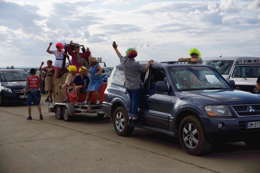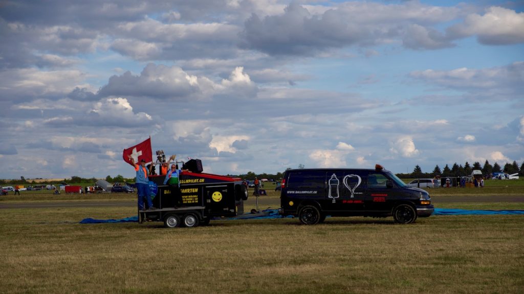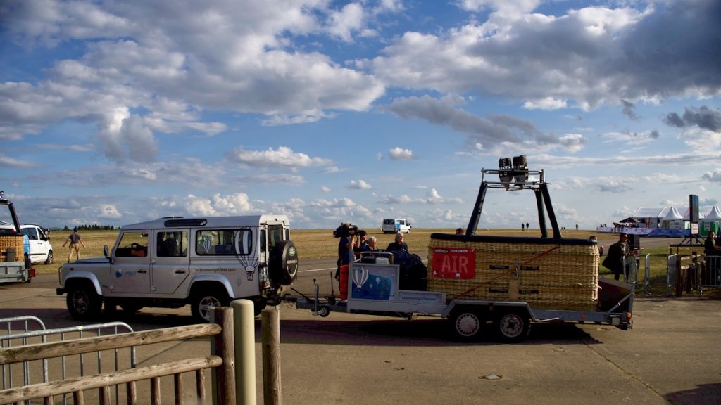 Pendant que l’appel des passagers commençait, j’ai aperçu un peu plus loin le défilé des pilotes qui, telles des rock stars, se dirigeaient vers le tarmac avec le véhicule contenant leur ballon démonté sous les vivats de la foule. A ce moment-là, il devait y avoir plusieurs milliers de spectateurs postés contre les barrières de sécurité pour assister à la préparation des ballons, ou un peu en arrière sur les espaces dégagés pour bénéficier d’une meilleure vue d’ensemble.