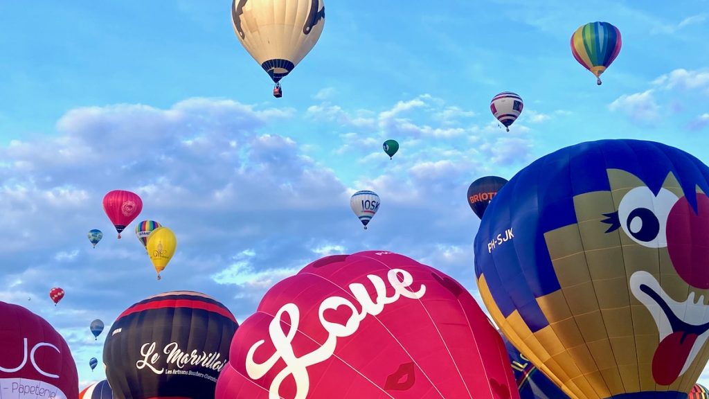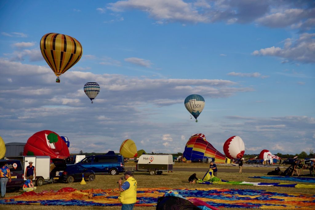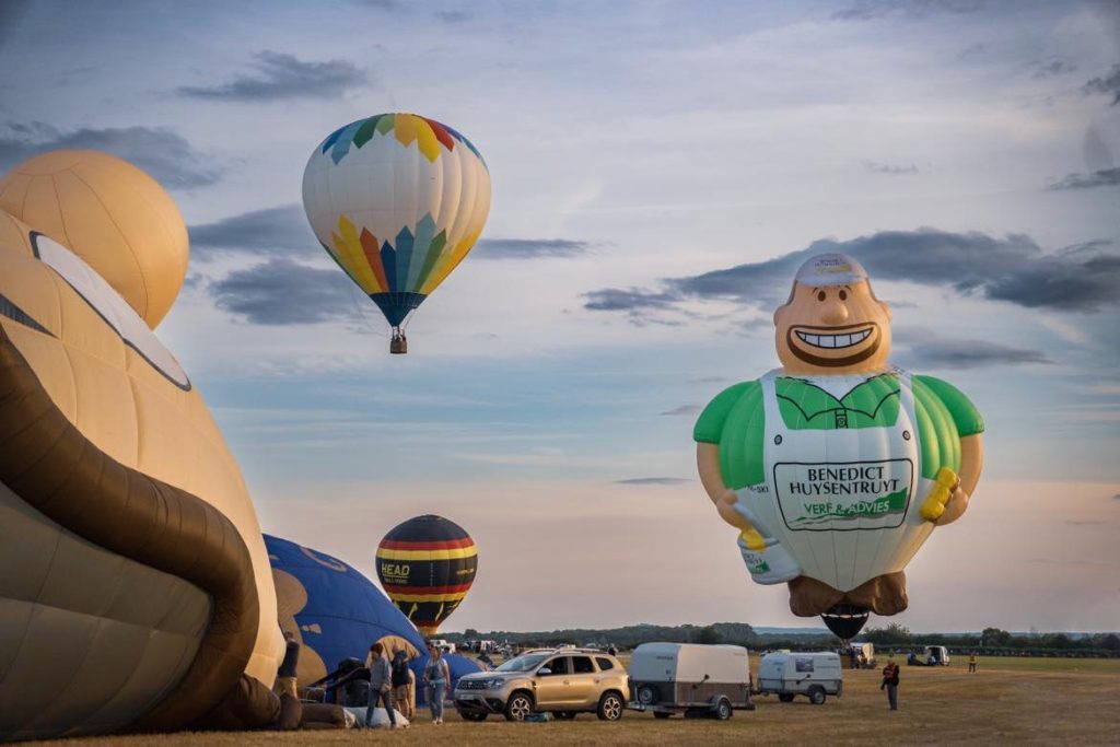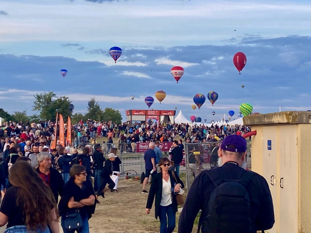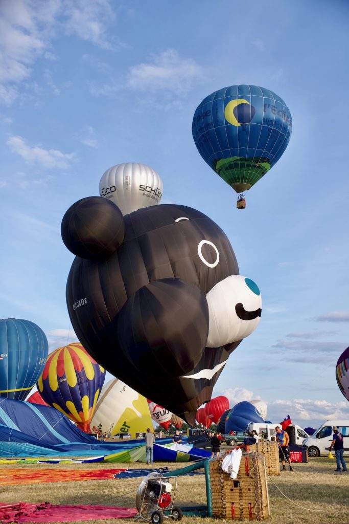 Les montgolfières ont décollé de façon très étalée dans le temps, sur une période d’environ une heure et demie, ceci évidemment afin de ne pas risquer qu’elles se percutent en l’air: la seule chose que peut contrôler le pilote, c’est l’altitude, pas du tout les déplacements latéraux qui sont fonction du vent. Certains ballons étaient ronds et multicolores; d’autres portaient le logo de leur sponsor; d’autres encore avaient des formes de têtes d’animaux (loup, chat, lapin, canard, nounours…), d’objets ou de personnages. La plupart étaient munis de nacelles en rotin de taille variable, mais quelques-uns n’avaient qu’un siège métallique à une ou deux places suspendu sous la toile. Il y en avait des petits et des très gros, et leurs pilotes représentaient soixante-dix pays différents. Nous avons notamment vu passer plusieurs ballons suisses et un aux couleurs de l’Ukraine, celui des Hottolfiades belges ainsi qu’une reproduction du ballon originel utilisé par Pilâtre de Rozière.