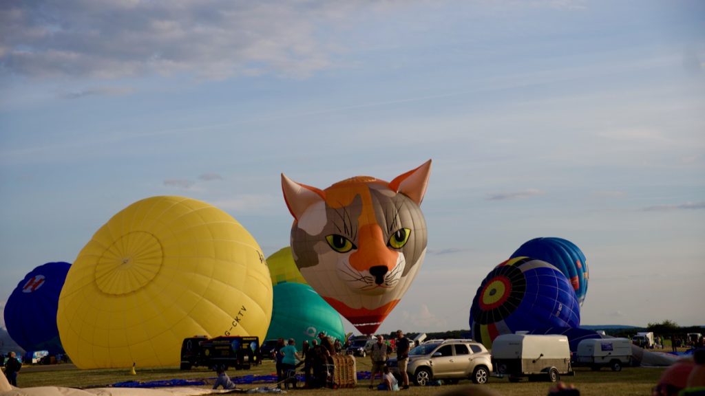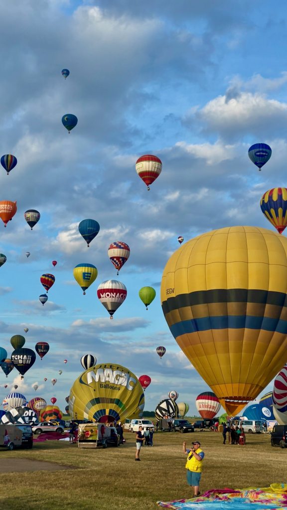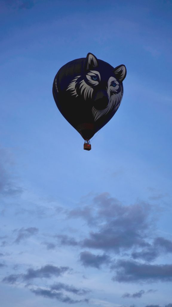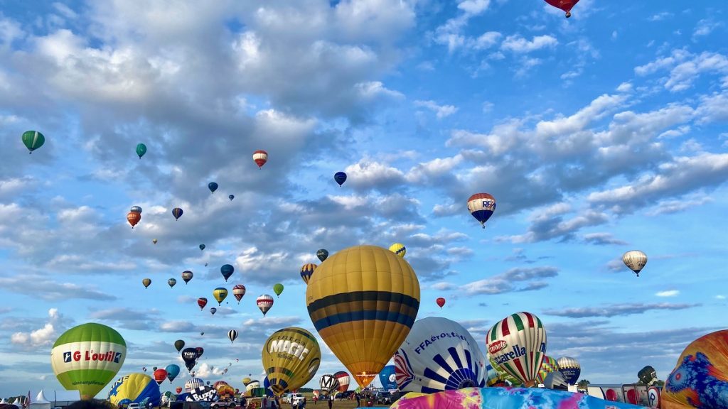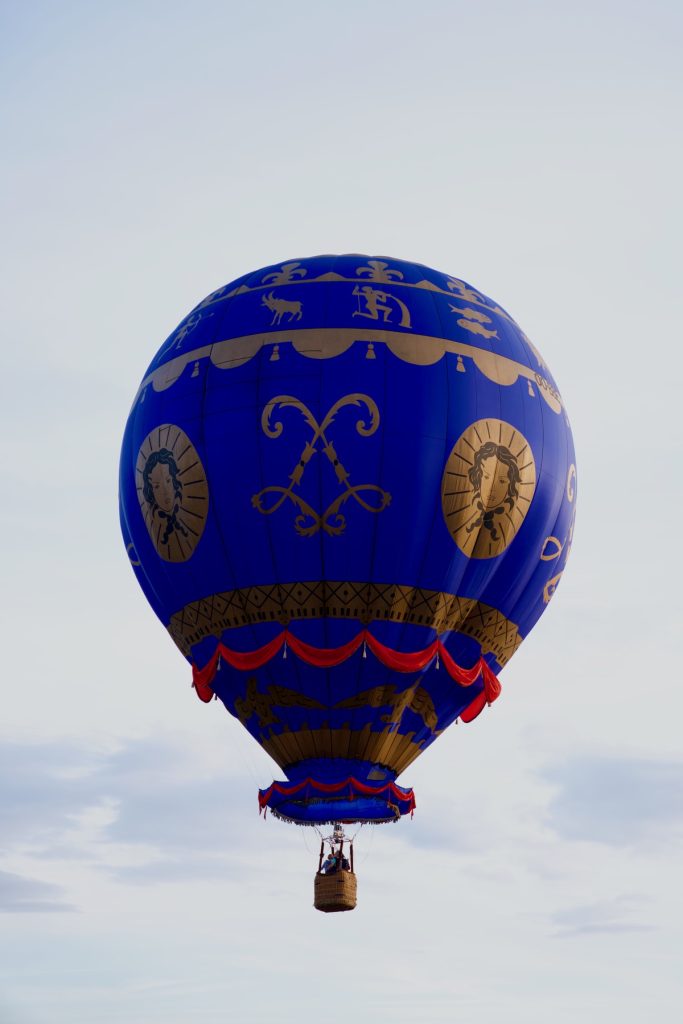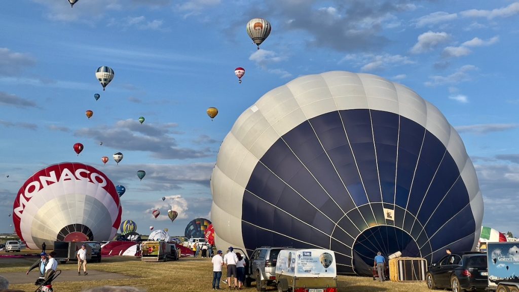 Les montgolfières ont décollé de façon très étalée dans le temps, sur une période d’environ une heure et demie, ceci évidemment afin de ne pas risquer qu’elles se percutent en l’air: la seule chose que peut contrôler le pilote, c’est l’altitude, pas du tout les déplacements latéraux qui sont fonction du vent. Certains ballons étaient ronds et multicolores; d’autres portaient le logo de leur sponsor; d’autres encore avaient des formes de têtes d’animaux (loup, chat, lapin, canard, nounours…), d’objets ou de personnages. La plupart étaient munis de nacelles en rotin de taille variable, mais quelques-uns n’avaient qu’un siège métallique à une ou deux places suspendu sous la toile. Il y en avait des petits et des très gros, et leurs pilotes représentaient soixante-dix pays différents. Nous avons notamment vu passer plusieurs ballons suisses et un aux couleurs de l’Ukraine, celui des Hottolfiades belges ainsi qu’une reproduction du ballon originel utilisé par Pilâtre de Rozière.