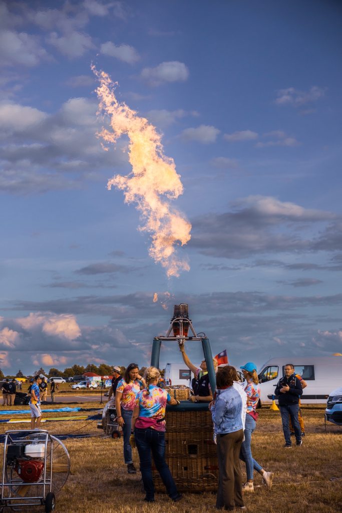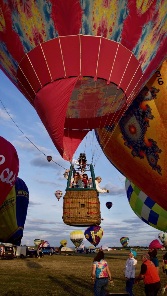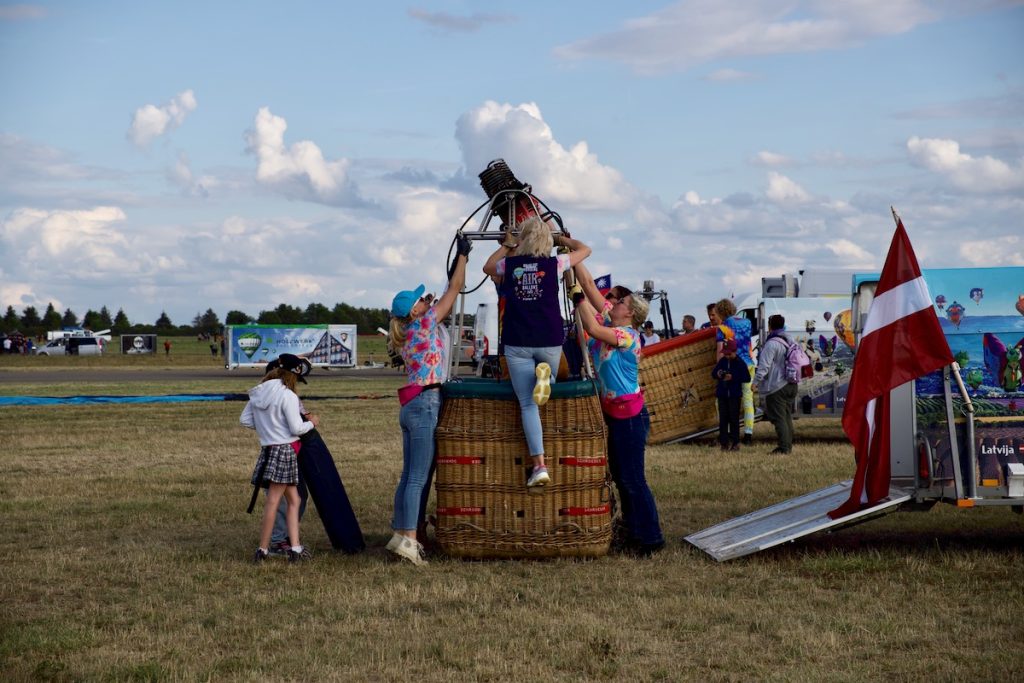 L’animateur muni d’un micro est venu se mettre face à nous pour expliquer différentes considérations techniques, parler de l’organisation du GEMAB et de l’histoire de l’aérostation, puis commenter le montage et le décollage des ballons. C’était très intéressant et nous avons appris plein de choses. La foule n’était heureusement pas trop dense à cet endroit, même si au bout d’un moment, j’ai dû finir par mettre des bouchons d’oreille pour supporter les éclats de voix. A quelques mètres de nous, les Sky Amazons, équipage letton entièrement féminin emmené par sa capitaine Inga Van Haver, préparait le Crystal Gloria, son ballon à l’enveloppe rose et bleue ornée de motifs psychédéliques. Mise en place et test du brûleur, gonflage de la toile – nous étions aux premières loges pour voir comment ça se passait.