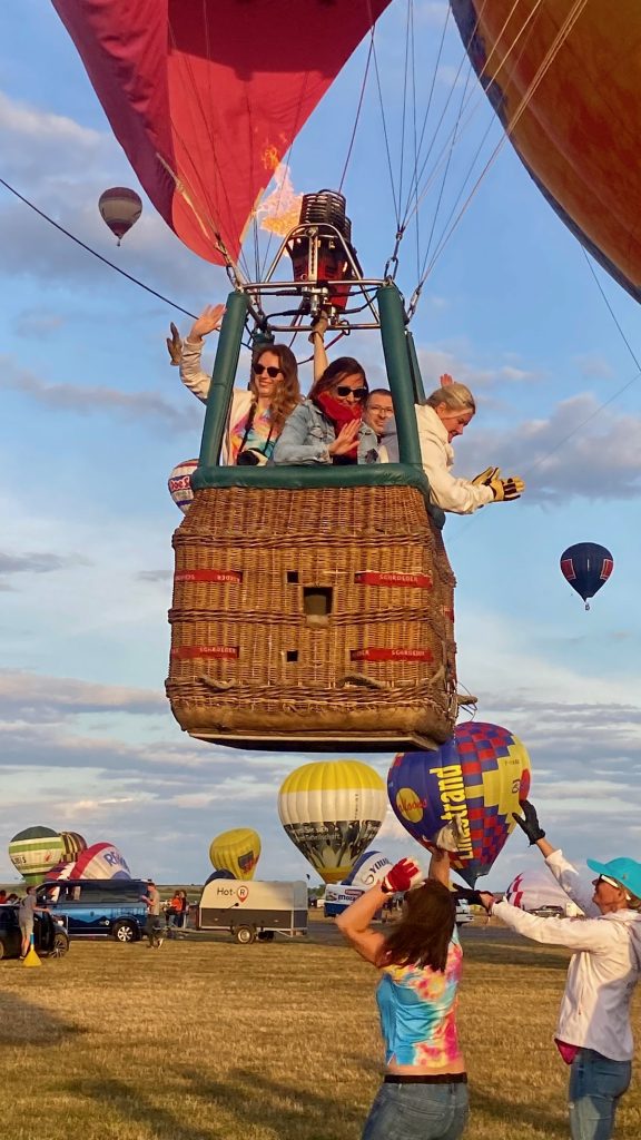 Inga a décidé d’emmener deux passagers choisis dans le public: les deux premières personnes à se manifester qui auraient le même anniversaire qu’elle. Pas le 26 mars, hélas, mais le 16 août. Et l’une de ces personnes était…. Mini-Papy! Je me suis dit: « Chouette, il va libérer sa place contre la barrière et je me retrouverai au premier rang ». Mais Mini-Papy a décliné l’invitation, et ses petits-enfants étaient encore d’une taille insuffisante pour un vol en ballon (il faut avoir les yeux plus haut que le bord de la nacelle, à la fois pour profiter du vol et pour pouvoir anticiper l’impact de l’atterrissage). Du coup, il a offert sa place à l’inconnue qui se trouvait sur sa gauche pendant que je pleurais un peu à l’intérieur. Jennifer, 41 ans, a sans le savoir échappé de peu à un rituel vaudou concocté par ma petite âme noire de jalousie.