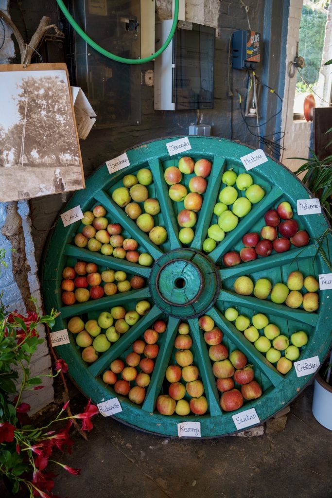 J’ai jeté mon dévolu sur des Boskoop aux couleurs joliment nuancées. Nous ne sommes pas de gros consommateurs de pommes (Chouchou ne les digère pas crues, et je n’aime pas les fruits croquants), mais je me voyais mal profiter du site sans acheter quelque chose en contrepartie. De toute façon, aucune tarte Tatin ni aucun cake aux fruits frais ne s’est jamais gaspillé à la maison.