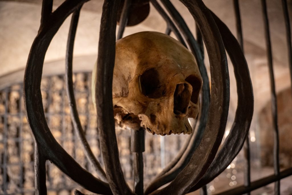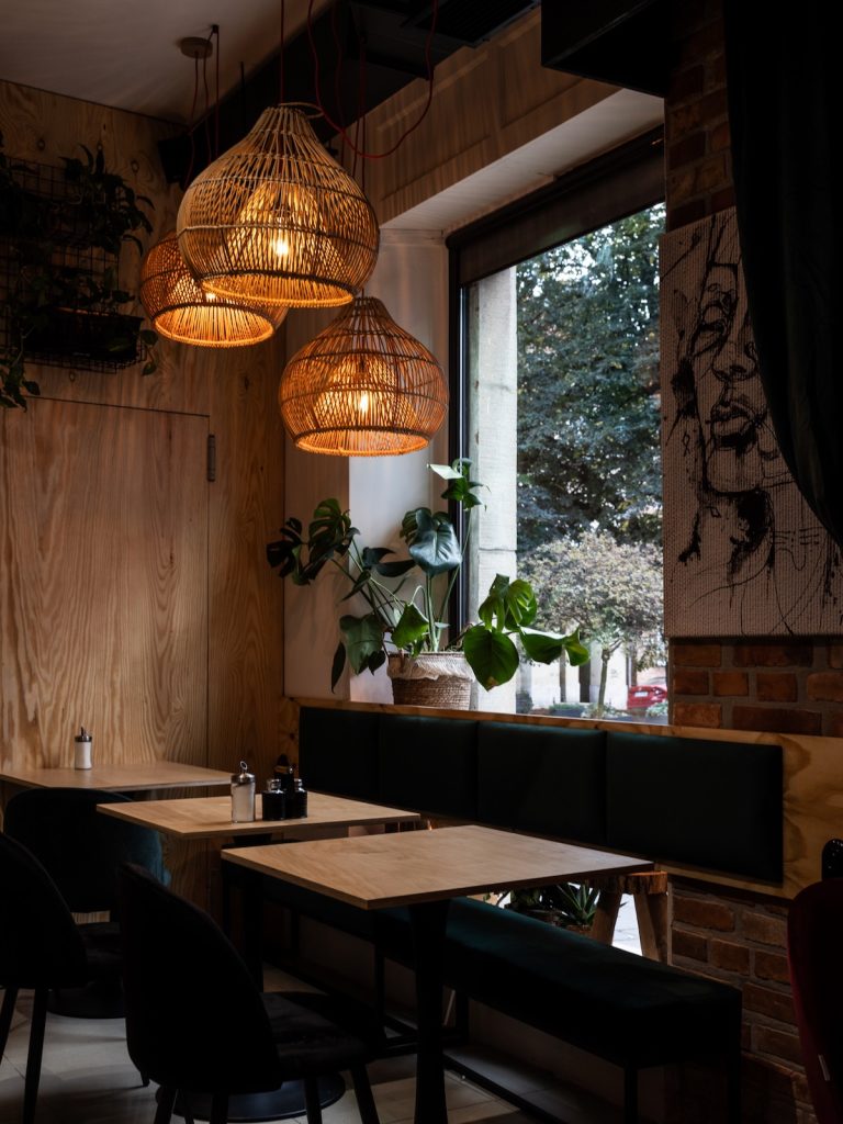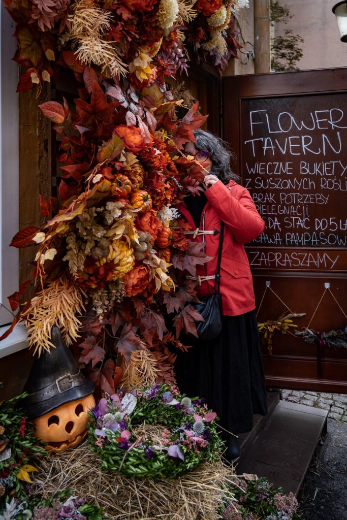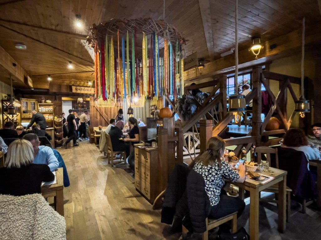 Il est à peine 17h quand nous commençons à faire la file devant Stary Mlyn, dont la devanture est décorée pour Halloween. Au bout d’un petit quart d’heure, une serveuse nous entraîne au sous-sol, dans un recoin sombre juste à côté de l’aire de jeux où s’ébattent des mômes braillards. Je lui dis poliment que je suis hyper sensible au bruit et que ça ne va pas être possible. Compréhensive, elle nous redirige vers une table de 4 juste à côté de l’entrée, ce qui nous convient très bien.