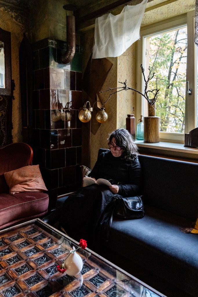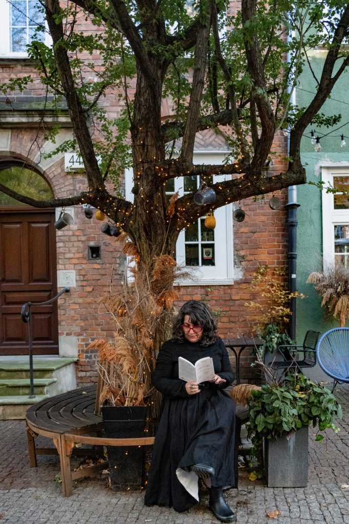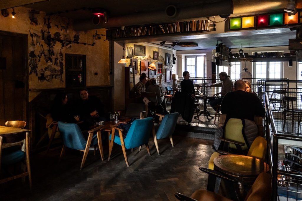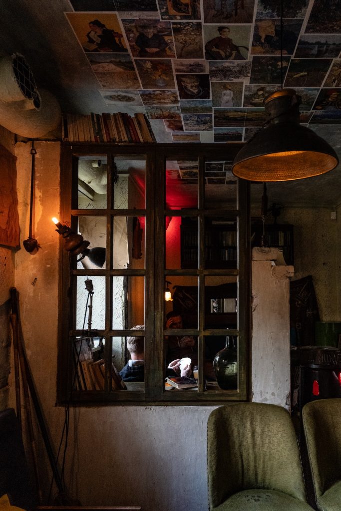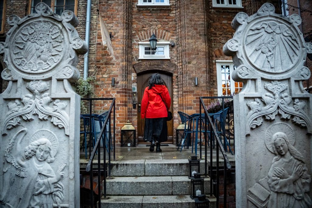 Après être passés devant le musée de l’ambre, la librairie jeunesse Firmin Księgarnia Artystyczn et le café Lamus que j’avais tous les trois notés sur ma Google Map mais dont aucun ne m’a donné envie de pousser sa porte, nous allons nous poser au célèbre café-bar Jozef K. L’ambiance est très jeune, la déco éclectique et l’offre de gâteaux décevante – rien que je puisse manger. Quant à mon chocolat chaud, il se révèle à peine tiède et trop sucré. Fatigués, nous passons néanmoins un moment tranquille à lire sur les canapés du premier étage.