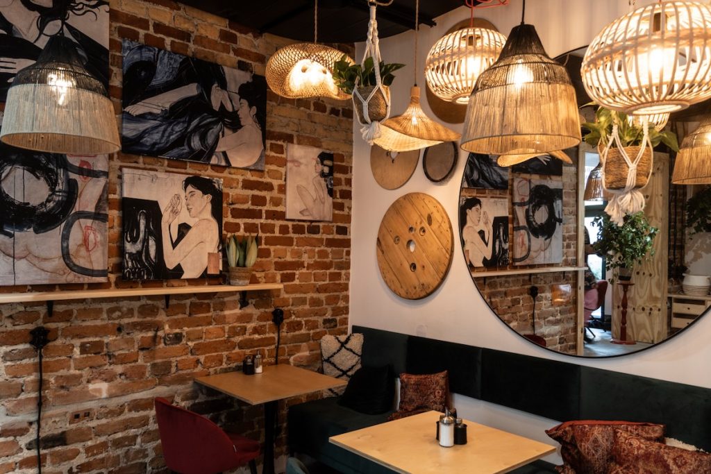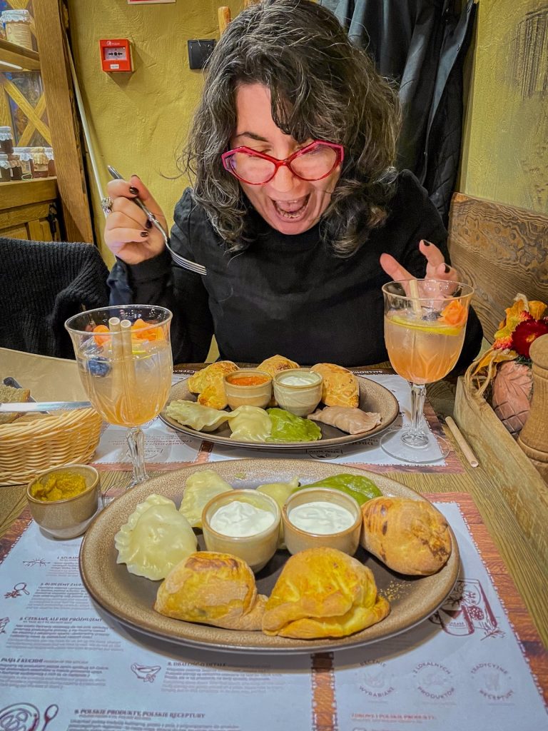 Histoire de goûter un maximum de choses, nous optons tous les deux pour le Megamix, une assiette composée de 3 pierogis au four et de 4 pierogis bouillis, variétés au choix parmi celles avec viande, les végétariennes, les véganes et les sucrées – accompagnées de deux sauces également au choix parmi une longue liste variée. Tout est délicieux, mais comme je m’en doutais, je cale au bout de 5 et Chouchou finit une fois de plus mon assiette. Avec deux limonades maison à la rhubarbe, la fraise et à la camomille, nous nous en tirons pour moins de 32€ pourboire inclus. Je rêve de prix similaires à Bruxelles…