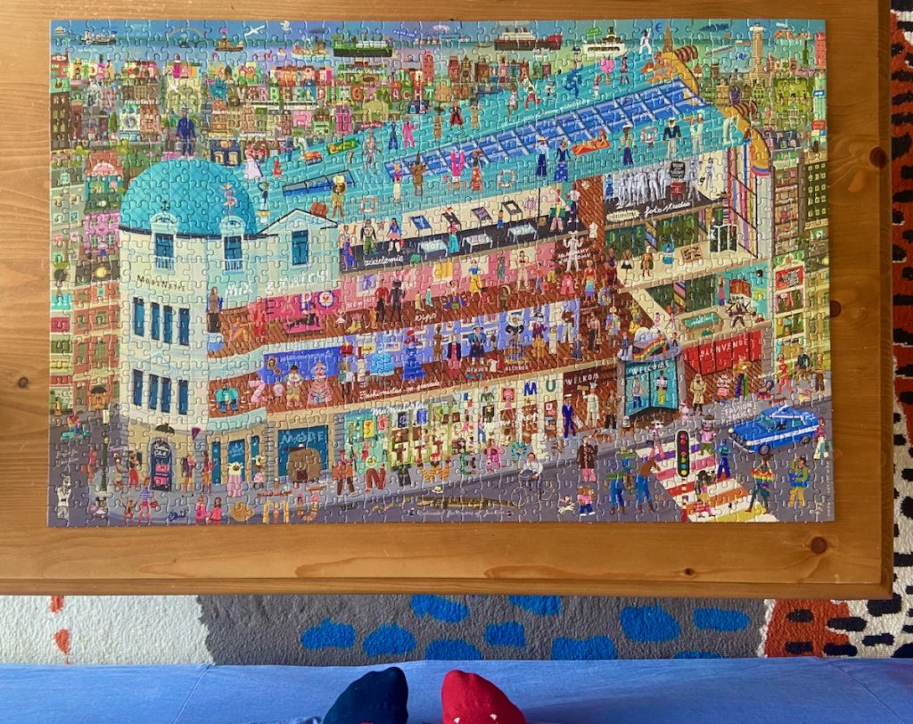 1. Le puzzle MoMu (Musée de la Mode d’Anvers) illustré par Tom Schamp. Je viens juste de le finir et je me suis régalée! Ses couleurs et sa multitude de détails me font penser à celui qu’Alexandre Clérisse a réalisé à partir de la filmographie de Wes Anderson.