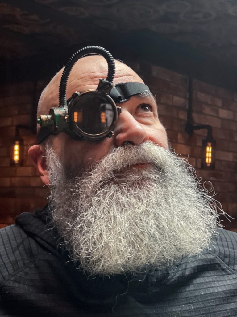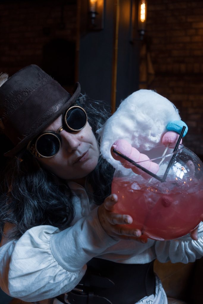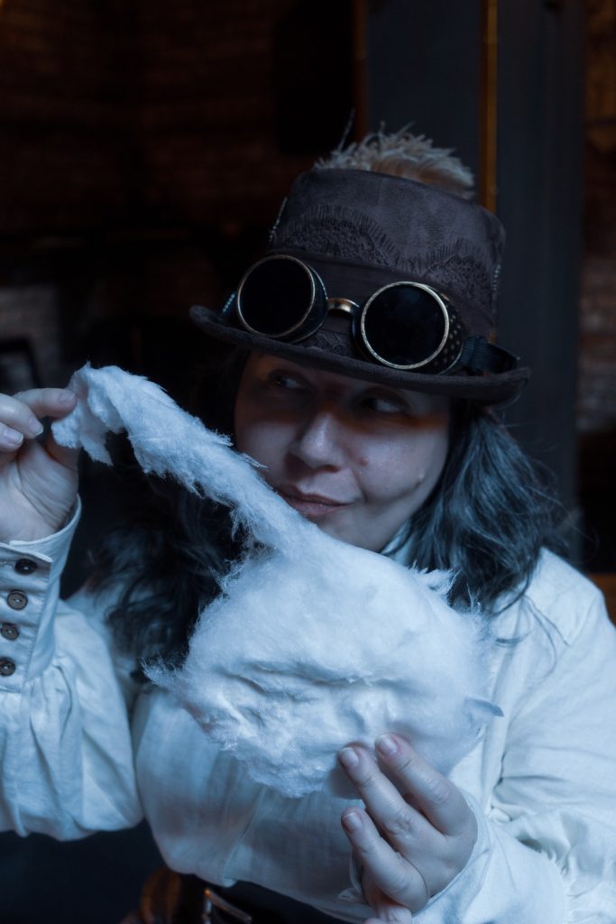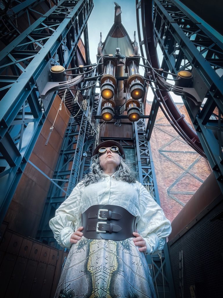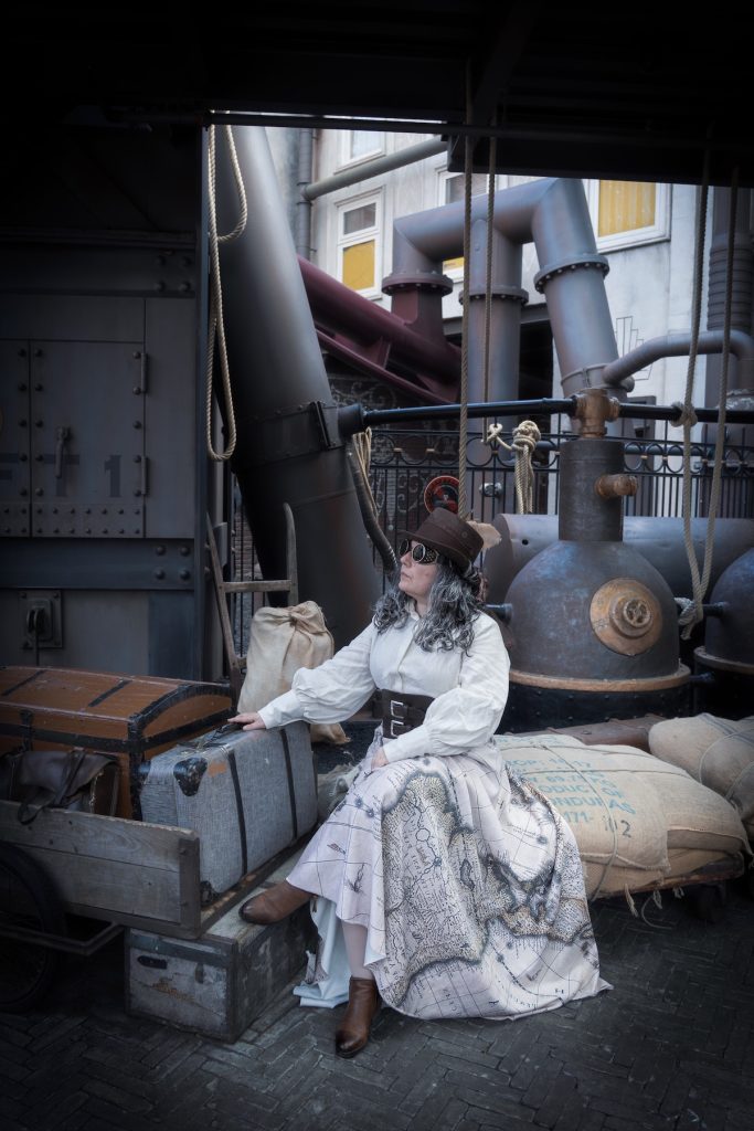 Puis ça a été la course pour me constituer une nouvelle tenue steampunk. UPS retenait ma longue-vue venue d’Inde en otage, exigeant un formulaire d’importation que je n’étais pas tenue de remplir en tant que particulier. Uchronic Time m’a envoyé une jupe dans laquelle je flottais – mais a très bien rattrapé le coup en m’expédiant la bonne taille en express pour que je l’aie avant de partir. Enfin, Satan m’a fourni un chapeau parfait, avec goggles détachables, pour un prix dérisoire. J’ai complété avec une chemise en lin Pavietra et un corset achetés sur Etsy il y a longtemps, plus des bottines Coqueterra oubliées au fond d’un placard.