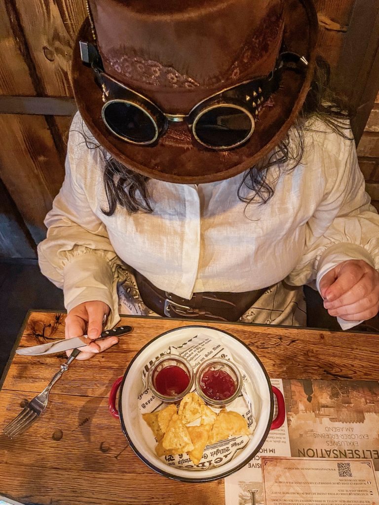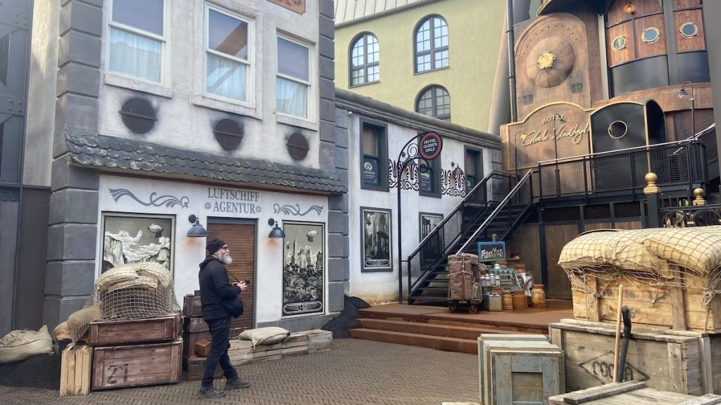 Comme la première fois, j’avais réservé un séjour de 3 jours et 2 nuits à l’hôtel Charles Lindbergh. Inclus dans notre forfait hébergement: les entrées au parc, 6 fast pass pour le F.L.Y., deux dîners et deux petits-déjeuners au restaurant Uhrwerk. A cela, il a fallu rajouter les billets de train pour Brühl via Cologne (beaucoup moins chers, même à la dernière minute, que l’Eurostar pour Paris) et les repas de midi + goûters dans le parc. Nous n’avons pas dépensé grand-chose d’autre: Phantasialand n’est pas Disneyland; il n’abrite que très peu de boutiques et n’invite pas du tout à claquer des sommes folles en peluches mignonnes ou autres objets dérivés. Tout en approuvant ce côté peu mercantile, j’avoue tout de même que je déplore l’absence d’un petit corner avec des objets steampunk!
