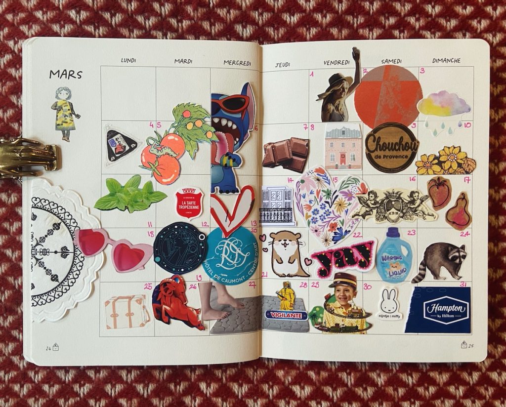 4. Remplir le carnet « Joie de coller toute l’année » de Julie Adore, et notamment son calendrier mensuel où coller un petit papier chaque jour. La récolte n’est pas aisée quand je passe des semaines entières sans sortir de chez moi, mais comme je fais de l’art journaling par ailleurs, j’ai toujours les tiroirs pleins de trucs qui peuvent faire le job. Et je trouve ça vraiment amusant.