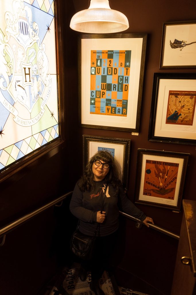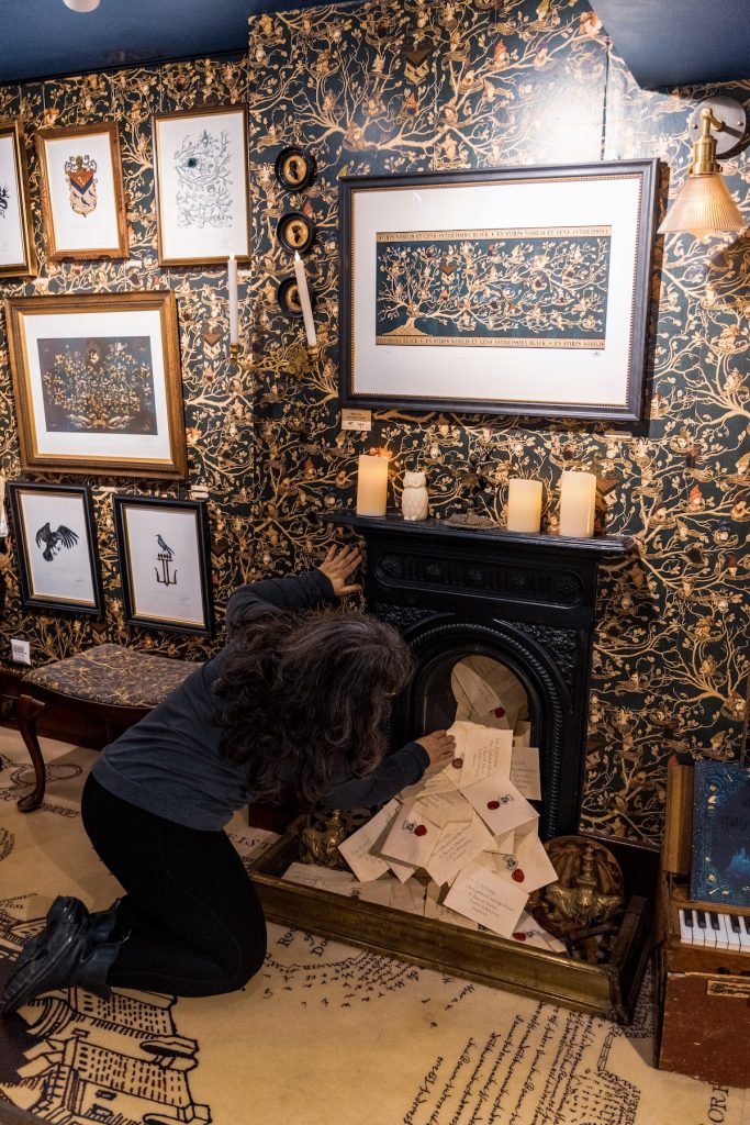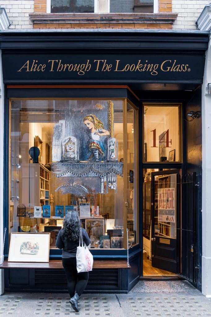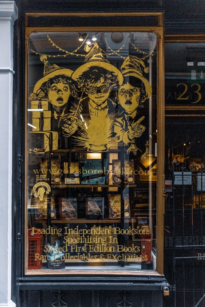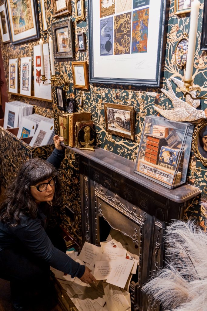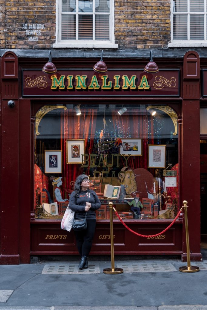 Nous passons ensuite chez Gosh! Comics, où je craque pour une collection d’essais graphiques sur l’incertitude, puis faisons un petit tour au magasin Wolf & Badger voisin où je résiste au chant des sirènes d’une paire de pantoufles en peluche blanche ornées de superbes broches rouges et roses « Fuck » et « Off ». Nous terminons cette virée shopping chez House of MinaLima (le studio de design responsable des décors des films « Harry Potter », qui a également produit de splendides éditions illustrées et pop-up de nombre de classiques de la littérature enfantine). En arrivant sur place, j’hallucine à la vue de la queue devant la porte d’entrée. Mais nous prenons notre mal en patience, et nous faisons bien, car à l’intérieur, la galerie sur deux étages est absolument magique.