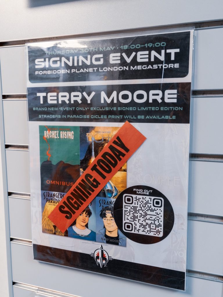 Nous y passons un assez long moment avant de nous diriger vers un de mes stops londoniens historiques: le Forbidden Planet. La librairie a bien changé depuis que je l’ai découverte au début des années 1990; désormais, on y vend plus de produits dérivés que de livres. La foule nous aide à réfréner nos impulsions d’achat. Nous sommes sur le point de ressortir les mains vides quand Chouchou me dit: « Tu as vu? » et me désigne une affichette devant laquelle j’étais passée sans la remarquer. Terry Moore, l’auteur de mon comics préféré « Strangers in Paradise », sera en dédicace aujourd’hui à 18h.