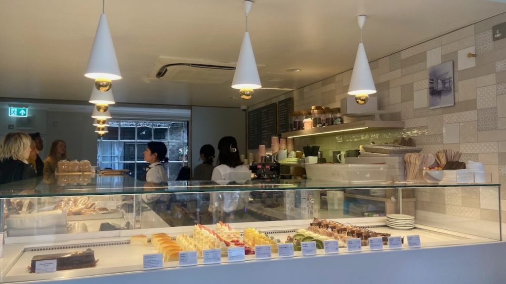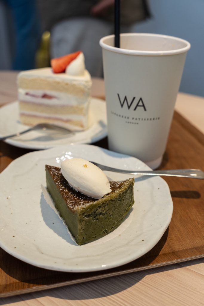 Il commence à pleuvoir; j’ai faim et envie de faire pipi. Nous nous arrêtons au Wa Café, une pâtisserie japonaise où, au terme d’un peu d’attente car l’endroit semble très populaire, nous réussissons enfin à obtenir une table. Après avoir hésité entre un cheesecake et un strawberry shortcake (mes deux gâteaux japonais préférés), j’opte pour le second, qui se révèle divin. Chouchou choisit le Gâteau Matcha et se régale également. Pour arroser le tout, un ice tea glacé au yuzu.